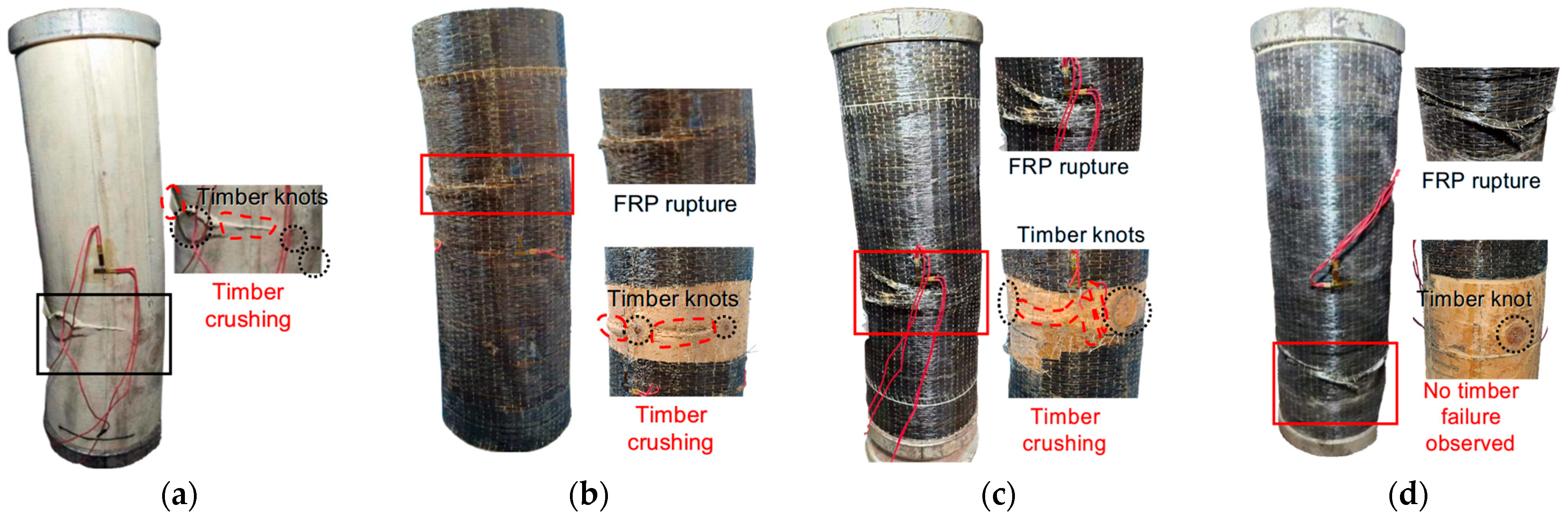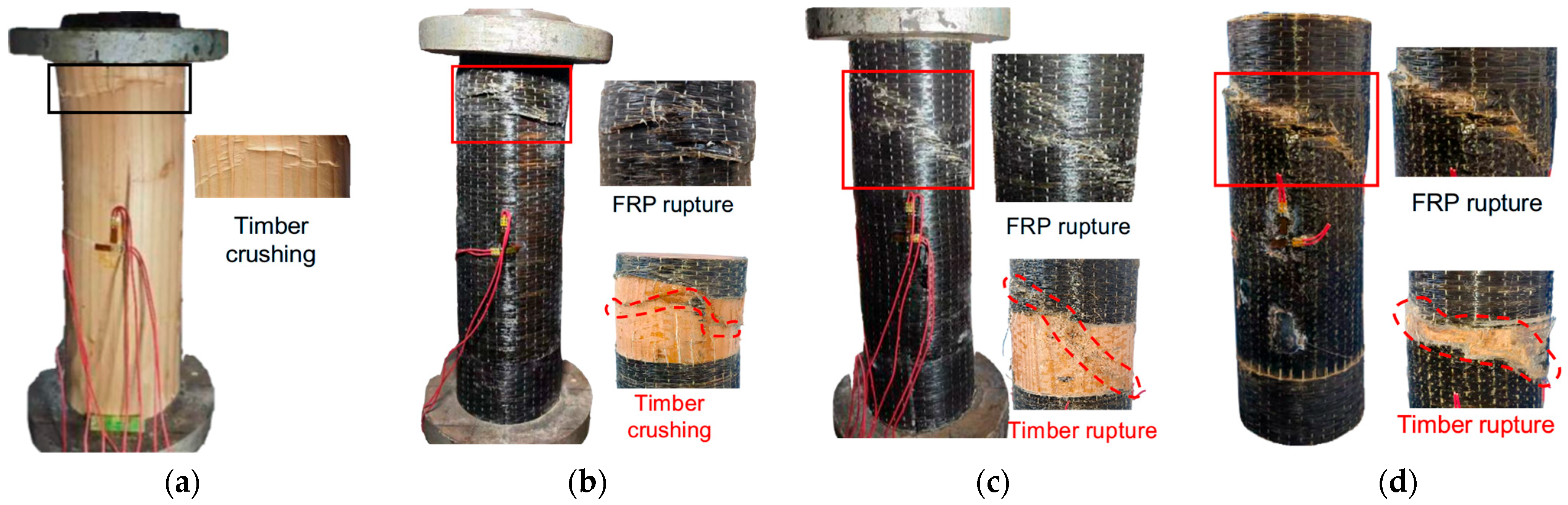 - Li, L.; Dong, J.; Wang, Q.; Yuan, S. Failure mechanism of timber column confined with FRP under the effect of fracture texture. Ind. Constr. 2014, 44, 25–29. [Google Scholar]