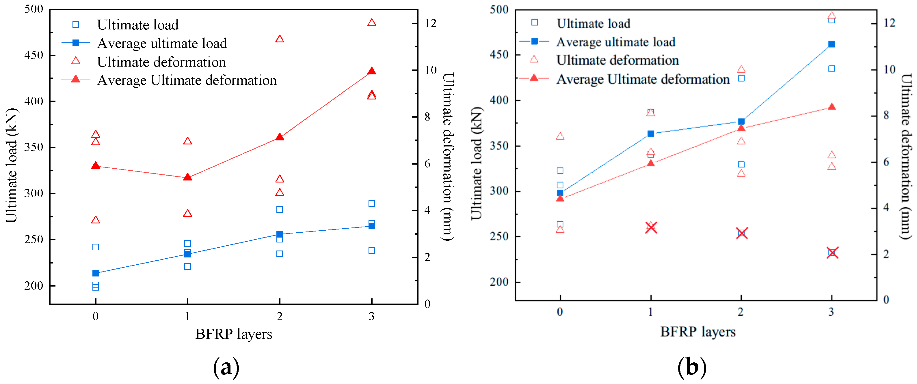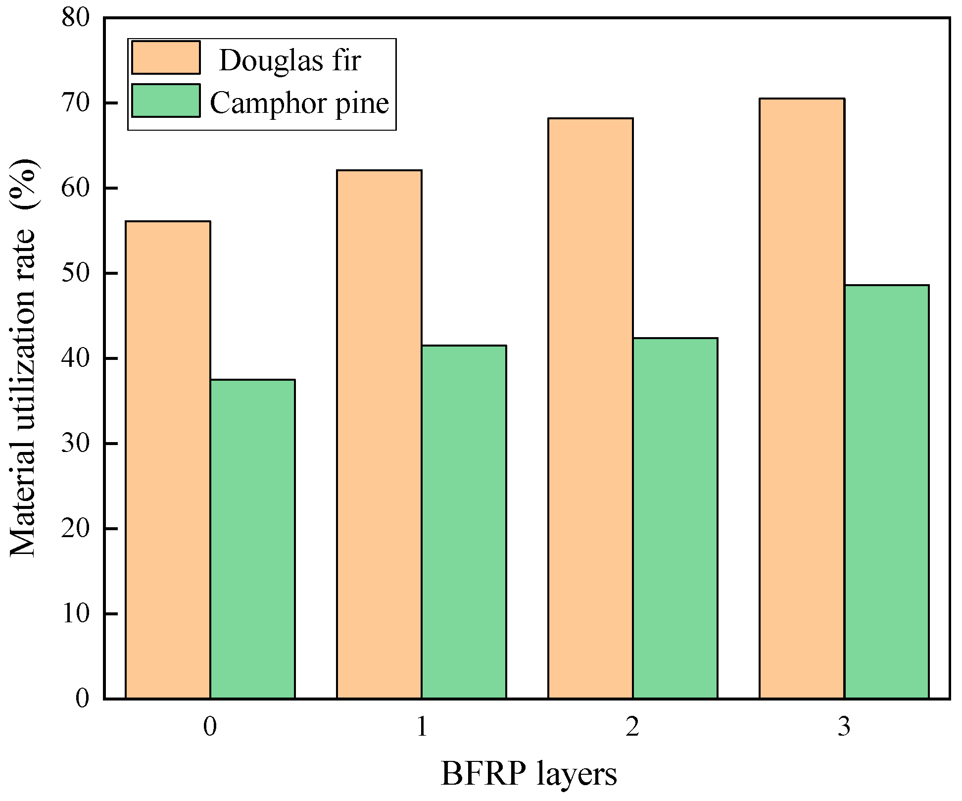 - Overall, an increasing number of BFRP layers can increase both the load-carrying capacity and ultimate deformation when one to three layers of BFRP are used. Compared to their unreinforced counterparts, the load-carrying capacity of BFRP-wrapped Douglas fir (knot-free) and camphor pine (with knots) specimens increased by up to 29.4% and 24.0%, respectively. However, the presence of knots resulted in a significant variance in the load capacity. Meanwhile, the ultimate deformation improved by as much as 90.7% for specimens with knots and 68.3% for those without.