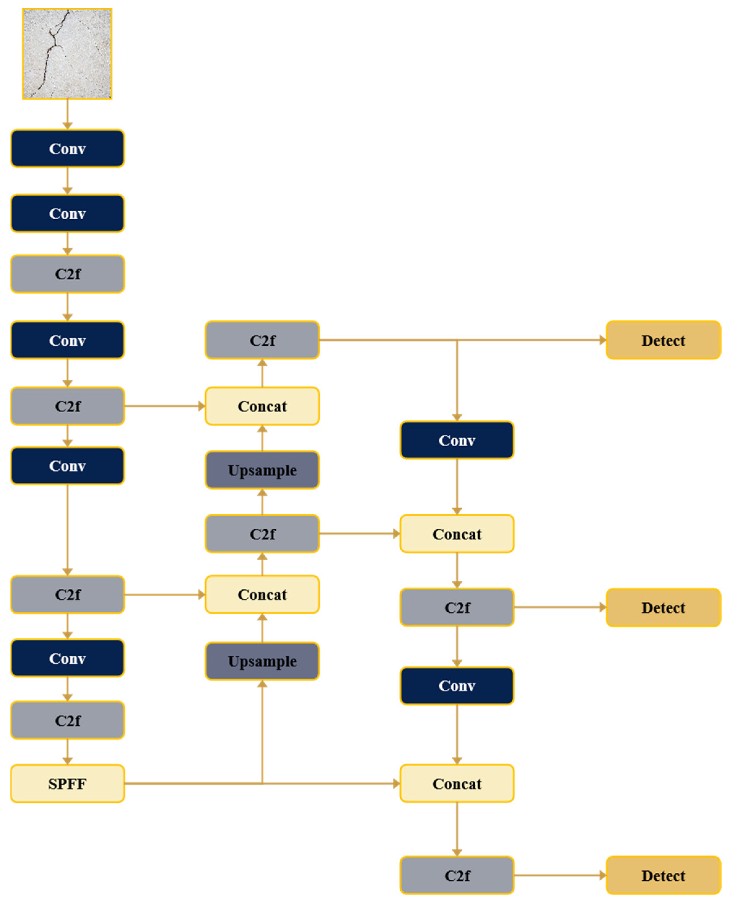 - SPPFInspired by SPPNet, the SPPF module utilizes several sequential small pooling kernels. It substitutes the three convolutional kernels of varying sizes in the SPP module with three 5 × 5 convolutional kernels, as two successive 5 × 5 kernels visually approximate a single 9 × 9 kernel. Similarly, three sequential 5 × 5 convolutions produce an equivalent effect to a single 13 × 13 convolution. Compared to employing large convolutions directly, cascading multiple smaller convolutions considerably decreases computational complexity and markedly enhance detection efficiency. Experimental results demonstrate that under identical input conditions, the outputs of the SPP module and SPPF module are consistent; however, the SPPF module functions at twice the speed of the SPP module. Figure 2 shows the structural settings of Conv, Bottleneck, C2f and SPPF.