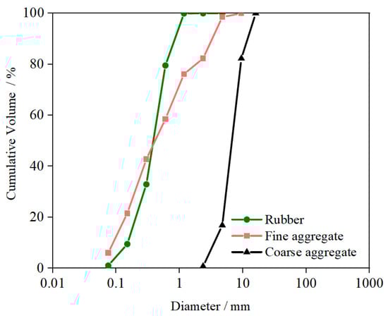 Figure 1 shows the various raw materials used in this study. P·O 42.5R ordinary Portland cement was employed in the present study. Natural river sand served as the fine aggregate, exhibiting a fineness modulus of 3.02, an apparent density of 2518 kg/m3, and a water absorption rate of 0.61%. Granite crushed stone with particle sizes between 4.65 and 10 mm was used as the coarse aggregate (Figure 2), having an apparent density of 2641 kg/m3 and a water absorption of 2.1%. The rubber particles used corresponded to a 20-mesh size (Figure 2), with an average diameter of approximately 0.38 mm. Copper-coated hooked-end steel fibers and glass fibers were selected as reinforcements, with their key physical and mechanical properties summarized in Table 1. Furthermore, a polycarboxylate-based superplasticizer was incorporated in specimen preparation, featuring a specific gravity of 1.02 and a solid content of 9%.