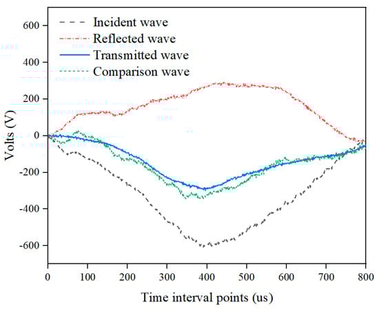To satisfy the assumptions of one-dimensional stress wave propagation and stress uniformity, achieving stress equilibrium within the specimen is a fundamental prerequisite for SHPB testing. Figure 5 illustrates the time histories of the incident stress wave σi(t), reflected stress wave σr(t), and transmitted stress wave σt(t) for the S1.2G0.4 specimen tested at a strain rate of 36.28 s−1. As shown, the superposition of the incident and reflected stress waves agrees well with the transmitted stress wave (σi(t) + σr(t) ≈ σt(t)), indicating that stress equilibrium was successfully established during the main loading stage. Moreover, wave dispersion effects are negligible throughout the test, suggesting that the stress within the specimen can be considered uniformly distributed. These observations confirm that the specimen reached a stable stress equilibrium state, thereby ensuring the reliability and validity of the experimental results obtained in this study.