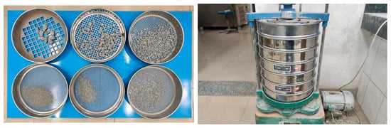 To further investigate the fragmentation behaviour at different strain rates, the fineness modulus of the fragments was determined following the sand fineness modulus testing procedure outlined in GB/T 14684-2022 [36]. The fragments from Figure 4 were sieved using six sieves with geometrically decreasing apertures of 20 mm, 10 mm, 5 mm, 2.5 mm, 1.25 mm, and 0.625 mm (Figure 7). The fineness modulus of the fragments in this study was computed using Equation (5):