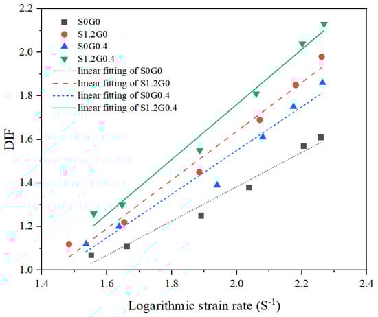 For all groups, DIF increased markedly with strain rate, and the hybrid steel–glass fiber mixture (S1.2G0.4) consistently exhibited higher DIF values than the other three mixtures throughout the tested range (~30–185 s−1). Fiber addition led to a significantly increased slope of the fitted curves relative to the plain rubberized concrete (S0G0). The descending order of the slopes for the four mixtures is as follows: S1.2G0.4 (1.26) > S1.2G0 (1.12) > S0G0.4 (1.00) > S0G0 (0.79). Compared with S0G0, S1.2G0.4 exhibits an increase of 59.5%. These findings suggest that the hybrid incorporation of steel and glass fibers significantly amplifies the strain-rate sensitivity of rubberized concrete, making this mixture’s strength most responsive to variations in strain rate. This further confirms that the combined incorporation of 1.2% steel fibers and 0.4% glass fibers in this study yields a positive synergistic effect.
