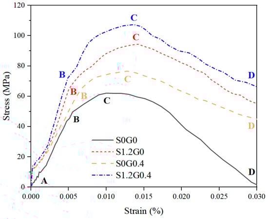 Compared to plain rubberized concrete (S0G0), the fiber-reinforced mixtures (S1.2G0, S0G0.4, S1.2G0.4) showed greater dispersion in both the elastic (A–B) and failure (C–D) stages, indicating that fibers regulate internal stress distribution and damage progression within the material. During the elastic rising stage, the addition of fibers increased the initial slope of the stress–strain curve, representing an enhanced dynamic elastic modulus, with steel fibers providing the most pronounced effect. During the subsequent stage of crack stabilization and propagation (B–C), the hybrid fiber group (S1.2G0.4) shows the steepest slope, indicating that the combined steel and glass fibers provide more effective confinement within the matrix. This delays the damage accumulation rate, allowing the material to maintain optimal load-bearing capacity even under damage conditions. With increasing load, the fiber-reinforced curves exhibited a gentler nonlinear hardening region near the peak stress, likely due to fibers bridging microcracks and thereby delaying macroscopic failure.