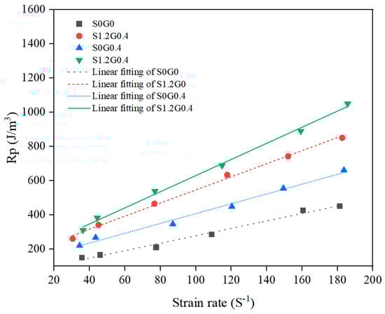 Similar to Equation (6), a represents the slope of the fitted curve, indicating the sensitivity of energy absorption to the strain rate. The fitted equations for each mix proportion are summarized in Table 7. The plain rubberized concrete (S0G0) exhibits the lowest slope (2.17) in the fitted Rp–strain rate line, suggesting a relatively limited increase in energy absorption with strain rate. With the addition of fibers, not only did Rp increase at the same strain rate, but the slope of its growth also rose substantially. The slopes of single glass fiber (S0G0.4) and single steel fiber (S1.2G0) mixtures increased to 2.87 and 3.83, respectively, showing that fiber incorporation strengthens the material’s ongoing energy dissipation under dynamic loading, with steel fibers providing a more significant enhancement owing to their higher elastic modulus and tensile strength. In the hybrid steel–glass fiber mixture (S1.2G0.4), the slope further increased to 4.71, with Rp consistently being the highest at all tested strain rates. This may indicate that the two fibers create a complementary energy dissipation system during dynamic compression: steel fibers suppress macrocrack development via high-strength bridging, whereas glass fibers, leveraging their excellent dispersion and matrix adhesion, retard damage accumulation at the microcrack scale. Their synergistic interaction extends the time to reach peak stress, substantially improving the material’s total energy dissipation under impact loads.