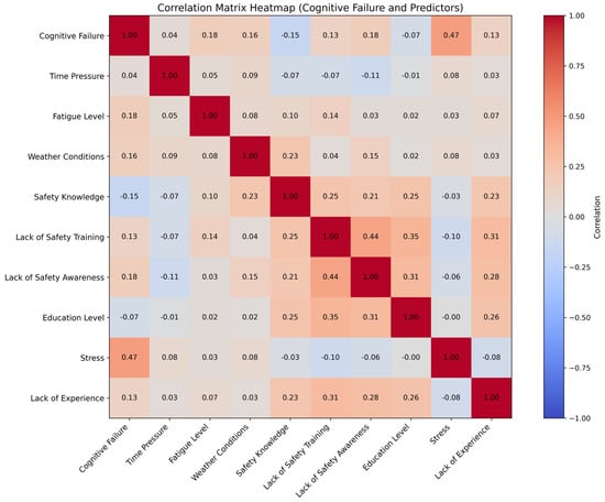 Correlation analysis, visualized in Figure 4, examined the relationships between cognitive failure and various predictors. The strongest positive correlation was between stress (S) and cognitive failure (r = 0.474, p < 0.05), confirming that higher stress levels increase the likelihood of cognitive lapses. Moderate positive correlations were observed with fatigue level (FL), lack of safety awareness (SA), weather conditions (WC), and lack of safety training (ST), while safety knowledge (SK) showed a negative correlation with cognitive failure (r = −0.149, p < 0.05), indicating that better safety knowledge reduces the likelihood of cognitive lapses [9,10]. The heatmap further highlighted strong positive relationships between safety training and safety awareness (r = 0.445), and between education level and experience (r = 0.261), emphasizing the importance of knowledge and experience in mitigating cognitive failures.