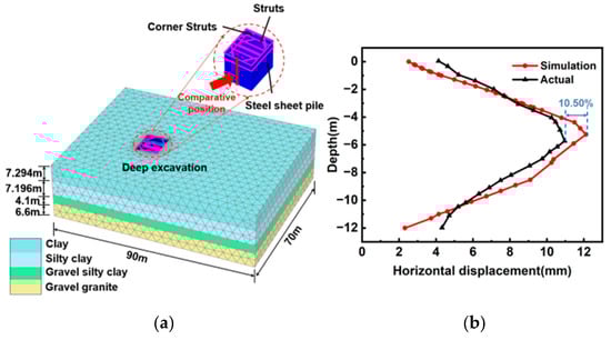 A three-dimensional finite element model was developed based on the excavation project of an elevated bridge (Figure 4a) [35] while following the actual construction sequence. To verify the reliability and accuracy of the finite element simulation method and software implementation, the computed horizontal displacements of the diaphragm wall were compared with the field measurements. As shown in Figure 4b, the numerical results exhibit good agreement with the observed displacement patterns, including both the maximum horizontal displacement and the overall deformation profile. Notably, the maximum diaphragm wall displacement obtained from the simulation is 12.11 mm, while the measured value is 10.96 mm, yielding a discrepancy of only 10.5%. The consistency between the numerical predictions and field data indicates that the finite element simulation method was reliable and that the accuracy of the modeling approach in this study was acceptable.