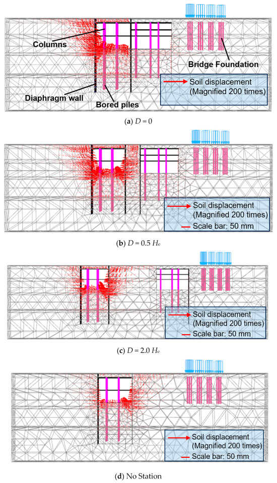 Vector diagrams of soil deformation under different distances: (a) D = 0, (b) D = 0.5 He, (c) D = 2.0 He, and (d) no station.