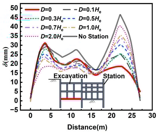 Figure 5 illustrates that the horizontal distance between the excavation and the existing station exerts a significant influence on the surrounding soil deformation, and the deformation pattern presents three typical modes as the spacing varies. When D = 0 (shared-wall condition) (Figure 5a), the absence of soil between the excavation and the existing station results in a distinct deformation pattern: the soil heave at the bottom of the excavation on the side away from the existing station is markedly greater than that on the existing station’s side, and soil displacement adjacent to the diaphragm wall on the far side also substantially exceeds that near the existing station. As the horizontal spacing increases, the deformation tends toward symmetry. At a moderate distance (0.5 He) (Figure 5b), the heave magnitudes at both sides of the excavation bottom become nearly balanced, with only slightly smaller soil deformation observed at the diaphragm wall on the existing station’s side compared with the far side. When the spacing further increases to D = 2.0 He (Figure 5c), the deformation’s distribution reverses. The existing station’s side exhibits noticeably larger soil heave beneath the excavation’s bottom and greater displacement near the diaphragm wall, resembling the deformation pattern of an excavation not unaffected by adjacent structures (Figure 5d). These observations demonstrate that the restraining effect of the existing station on the lateral soil deformation of the excavation progressively diminishes with increasing spacing and becomes negligible beyond a certain distance.