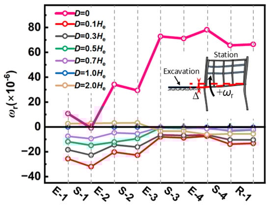 To evaluate the excavation’s impact on the existing station, the differential settlement Δ between the base slab ends and the inclination ratio ωr (ωr = Δ/L, where L is the slab length) serve as the primary indices. Positive ωr values denote a clockwise rotation, as illustrated in Figure 9. Under non-shared-wall conditions (0.1 He ≤ D ≤ 0.7 He), the existing station’s base slab exhibits a counterclockwise rotation. Specifically, at D = 0.1 He, ωr reached −25.67 × 10−6 after the first excavation stage. This trend intensified during roof-slab installation, peaking at −31.96 × 10−6. Although minor clockwise fluctuations occurred in subsequent steps (Δωr ranges from +0.67 × 10−6 to +14.77 × 10−6), the overall behavior remained dominated by a counterclockwise rotation, ending at −13.23 × 10−6. As the distance increased to 1.0 He ≤ D ≤ 2.0 He, the slab no longer showed persistent unidirectional inclination. At D = 1.0 He, the final ωr was merely −0.391 × 10−6, displaying slight fluctuations: an initial clockwise phase (max +0.03 × 10−6 to +3.68 × 10−6), followed by a counterclockwise shift. This suggests negligible excavation impact at such distances. Conversely, the shared-wall condition consistently induced pronounced clockwise inclination. The base slab immediately rotated clockwise after the first stage (ωr = +10.71 × 10−6), accumulating further rotation with each step until it stabilized at +66.45 × 10−6.