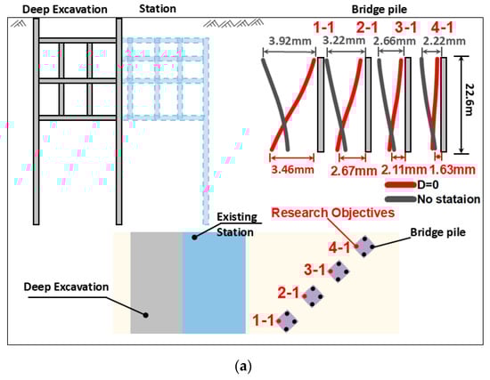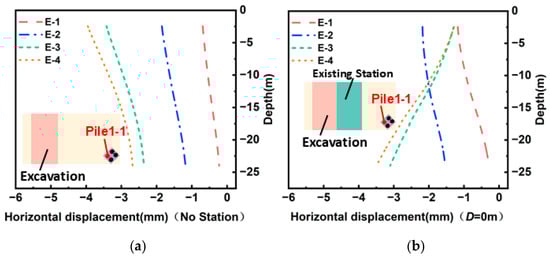 Figure 13a compares the final horizontal displacements of multiple bridge piles under both the no-station condition and the shared-wall excavation–station condition. In the shared-wall scenario, the horizontal displacement of the piles decreases progressively with increasing horizontal distance from the excavation. The maximum displacement occurs at the pile toe, where the magnitude reduces from 3.46 mm to 1.63 mm as the horizontal distance increases. Although the no-station condition exhibits a similar decreasing trend with distance, notable differences exist in both the location and magnitude of the maximum displacement. Without the station, the maximum horizontal displacement shifts upward to the pile head, and its value decreases from 3.92 mm to 2.22 mm, indicating that the overall displacement levels are higher than those observed in the shared-wall condition.