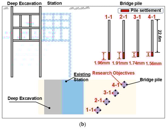 Extensive research has been conducted on excavation behavior under asymmetric conditions [28,29,30]. In the existing literature, studies on the asymmetric behavior of excavations can be generally categorized into three main types based on the origin of the asymmetry: (1) asymmetric external loading, (2) geometric or structural asymmetry, and (3) geological or environmental asymmetry. Most studies have focused on asymmetric external loading, such as nearby embankments, traffic loads, or unbalanced surface surcharges [28,29,31]. Several researchers have examined geometric or structural asymmetry, which depends on the design of irregular retaining systems [32] and the optimization of supporting structures [33]. Additionally, asymmetric geological or environmental conditions, such as stratigraphic heterogeneity or adjacent river channels [34], have also been explored. However, the asymmetry considered in these studies primarily originates from external factors or stratigraphic heterogeneity. When a new excavation is adjacent to an existing underground structure, such as a metro station, the asymmetry instead arises from spatial constraints imposed by the existing structure and the coupling mechanical interaction during construction. Currently, the mechanisms of asymmetric deformation and internal force transfer induced by such multi-structure coupling constraints, especially those involving the complex interaction among excavations, shared-wall stations, and adjacent bridge piles, have yet to be systematically elucidated and therefore warrant in-depth investigation.