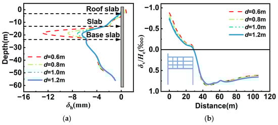 Figure 15 systematically analyzes the influence of shared diaphragm wall thickness on the deformation response of the existing metro station under shared-wall conditions. As illustrated in Figure 15a, increasing the wall thickness (d) from 0.6 m to 1.2 m causes the maximum horizontal displacement to decrease from 12.65 mm to 6.37 mm, exhibiting a declining trend. However, the depth of this maximum displacement remains constant at approximately 19.50 m, showing no vertical shift with thickness variations. Figure 15b indicates that as thickness decreases, ground heave in the 0–25 m heave zone adjacent to the station intensifies, with peak surface heave rising from 0.73‱ He to 0.88‱ He. Similarly, in the settlement trough located roughly 40 m from the excavation, maximum ground settlement expands, with the peak value growing from 0.82‱ He to 0.85‱ He. These behaviors are attributed to two mechanisms: First, increasing the shared wall’s thickness enhances bending stiffness, limiting lateral flexure under identical excavation loads. Since the existing station provides a stable constraint, the wall’s deformation mode remains consistent across varying thicknesses, ensuring that the maximum displacement depth remains invariant. Second, a thicker wall improves the station–wall system’s overall stability, mitigating the extent and degree of surrounding ground disturbances.