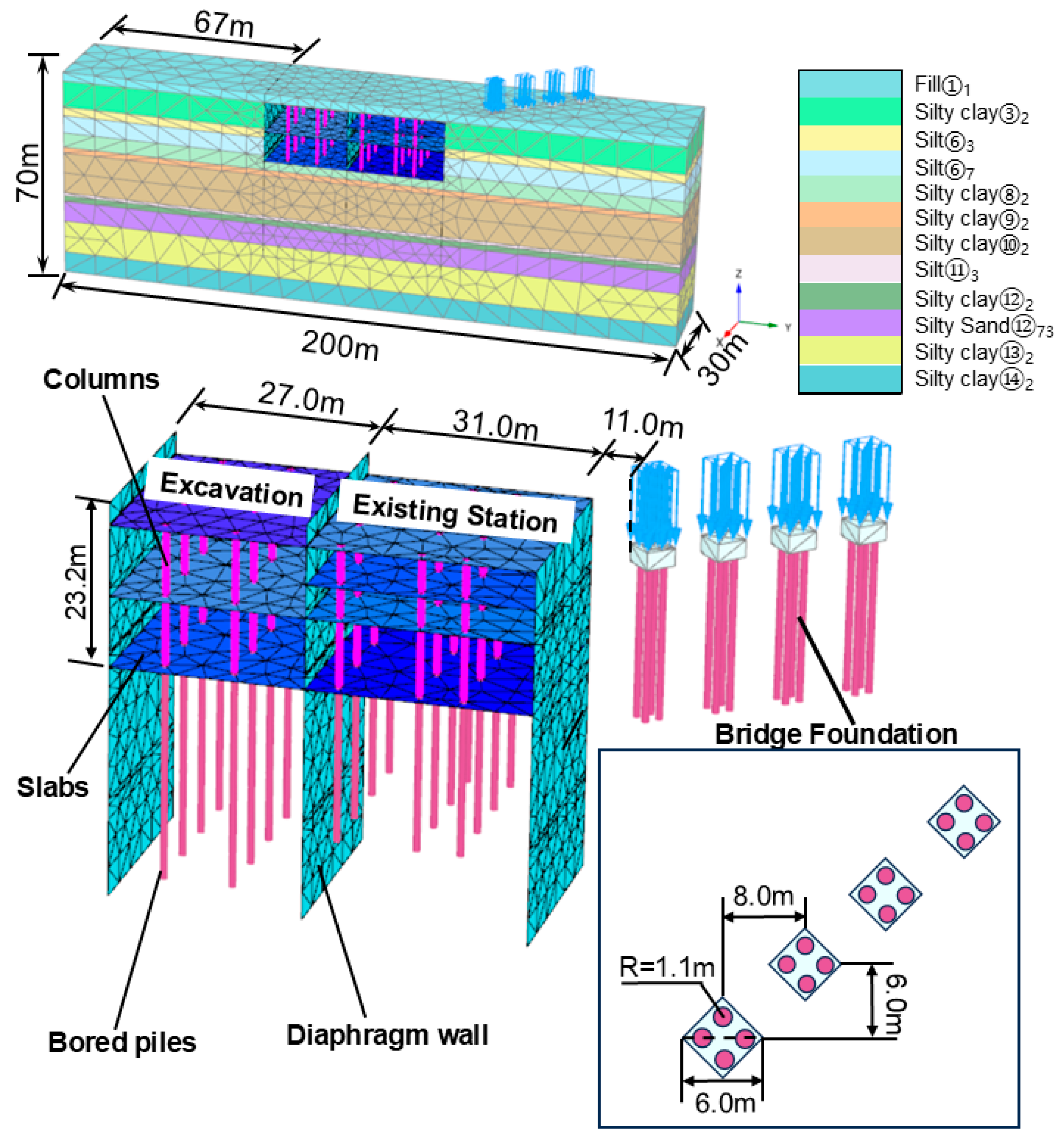 - Xiang, X. Comparative analysis of deformation of adjacent station caused by different construction sequence of foundation pit. J. Railw. Eng. 2015, 32, 80–85. (In Chinese) [Google Scholar]