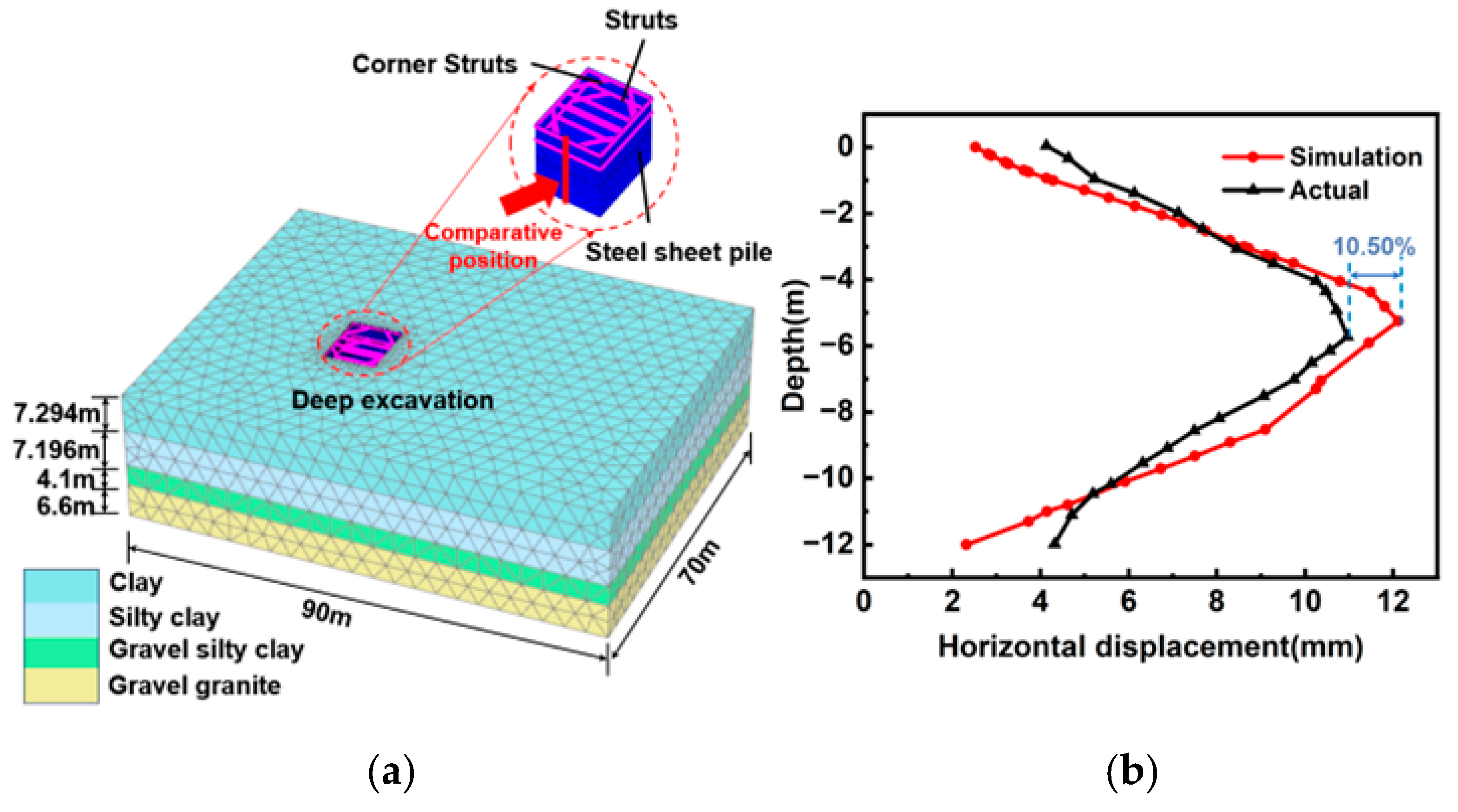 - Chen, S.-L.; Zhang, F.; Dai, N. Studies on stress and deformation behaviors of deep excavations adjacent to substructures. J. Shanghai Jiaotong Univ. 2016, 50, 1658–1664. (In Chinese) [Google Scholar]