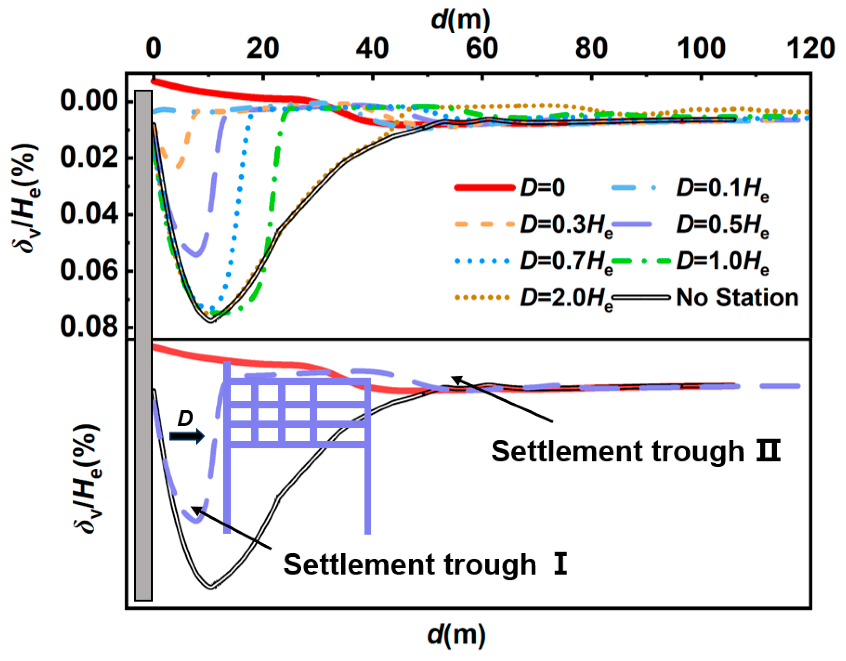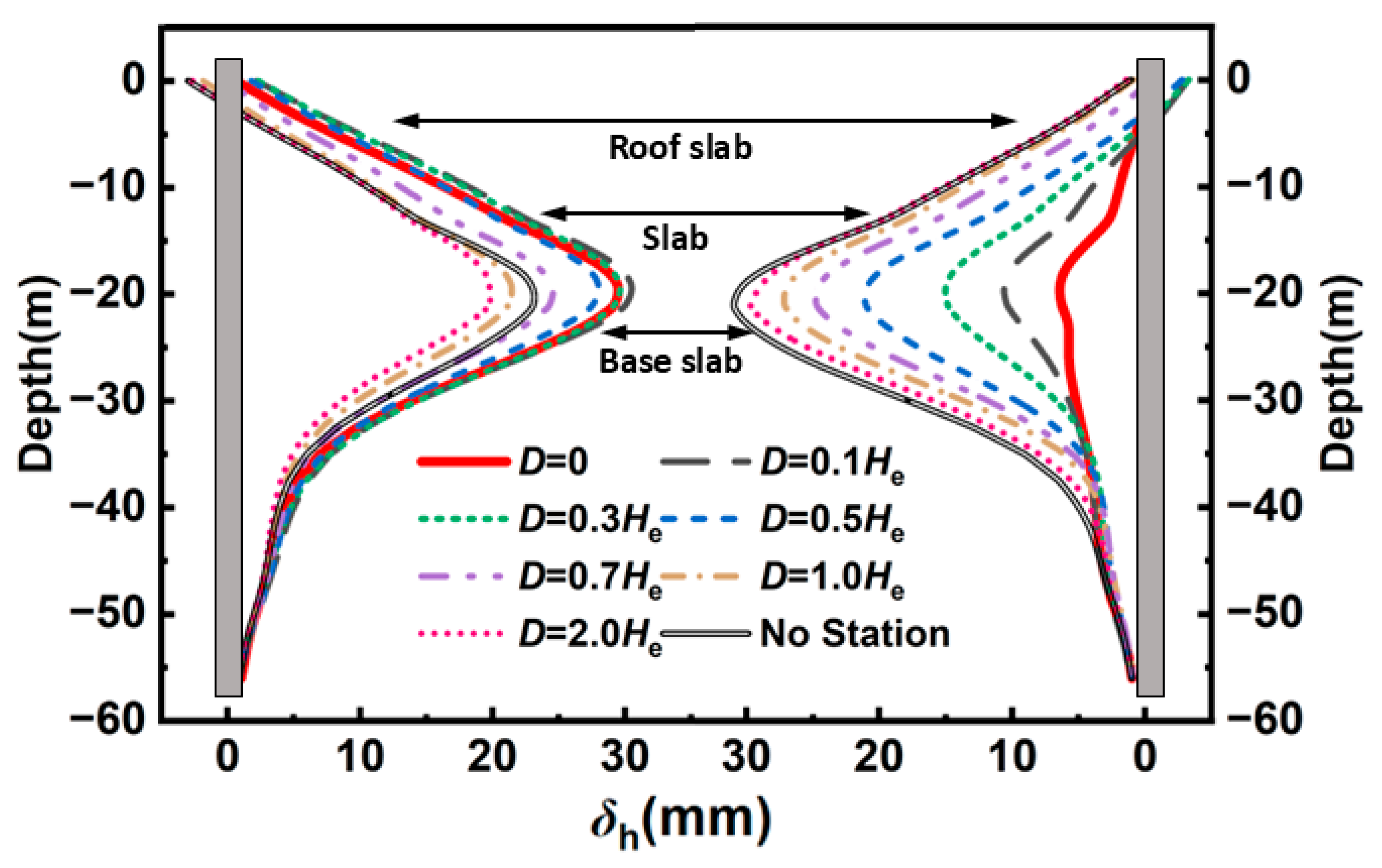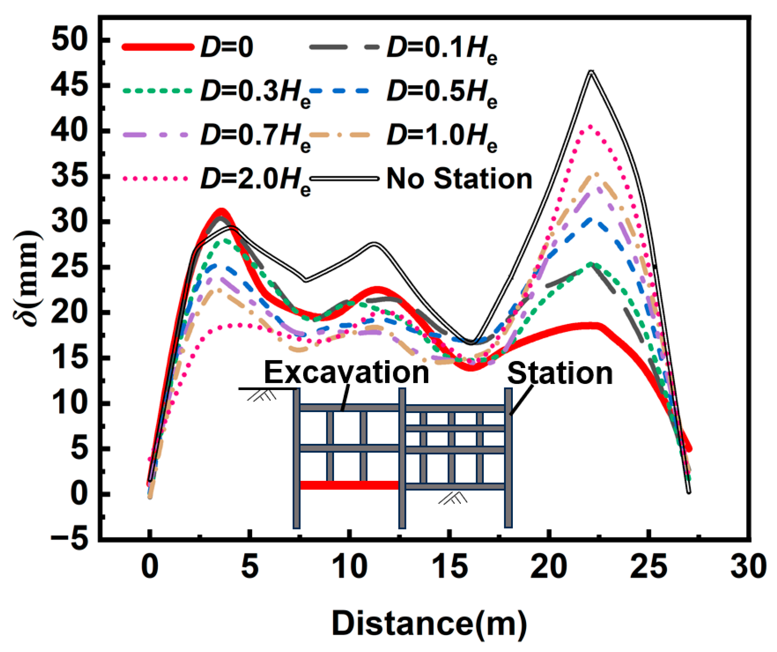 | Distance between the excavation and existing station (D) | 0, 0.1 He, 0.3 He, 0.5 He, 0.7 He, 1.0 He, and 2.0 He |