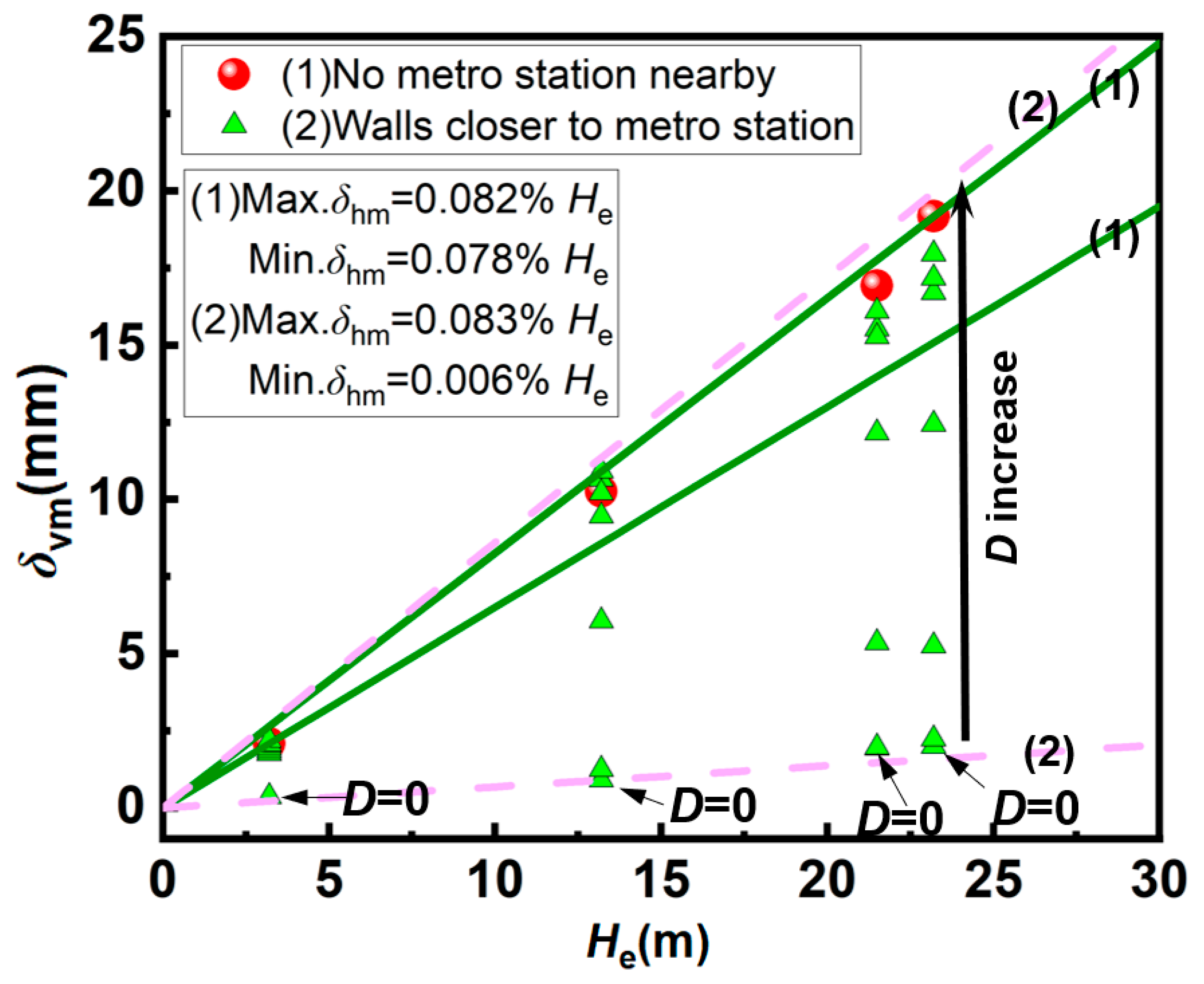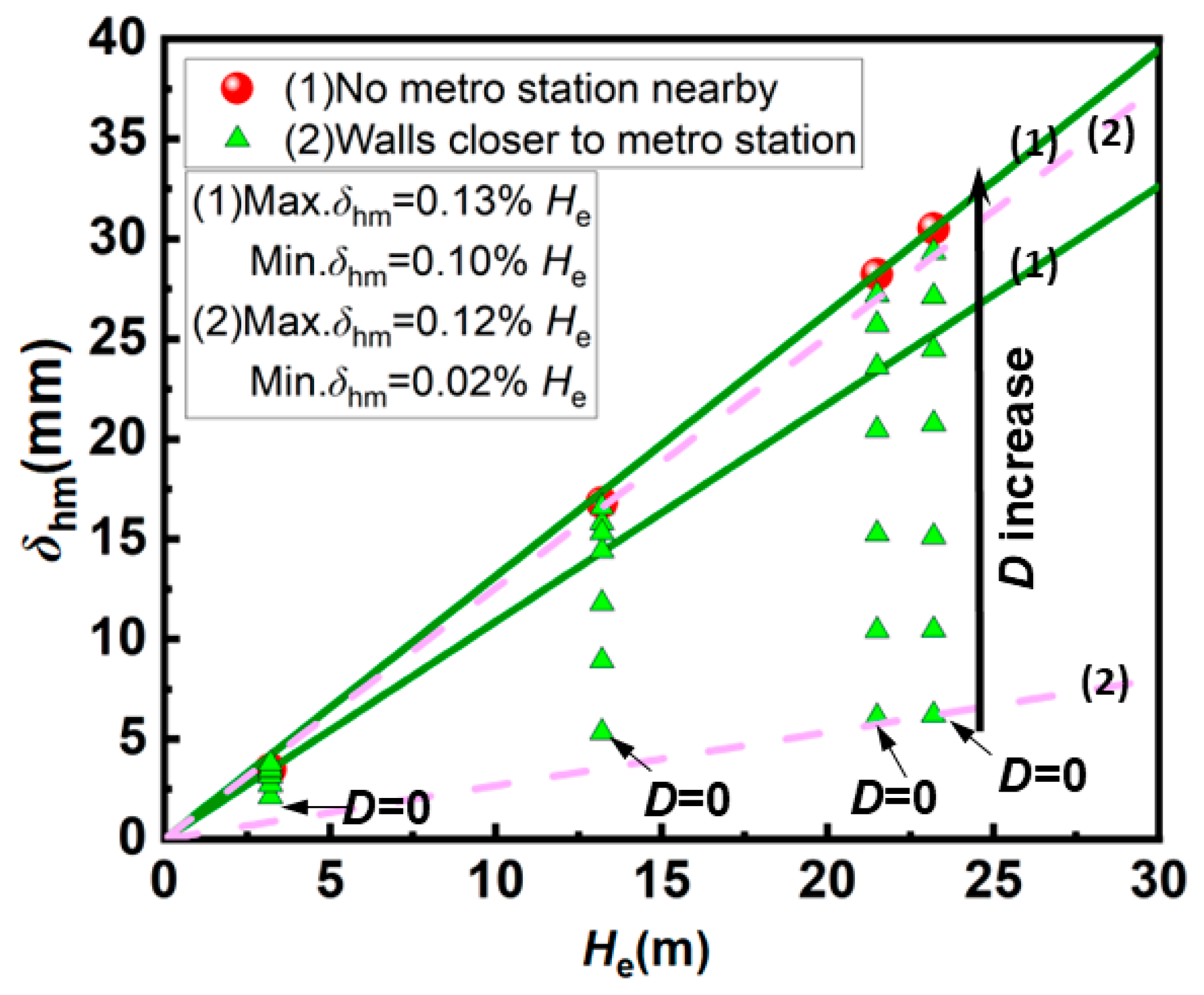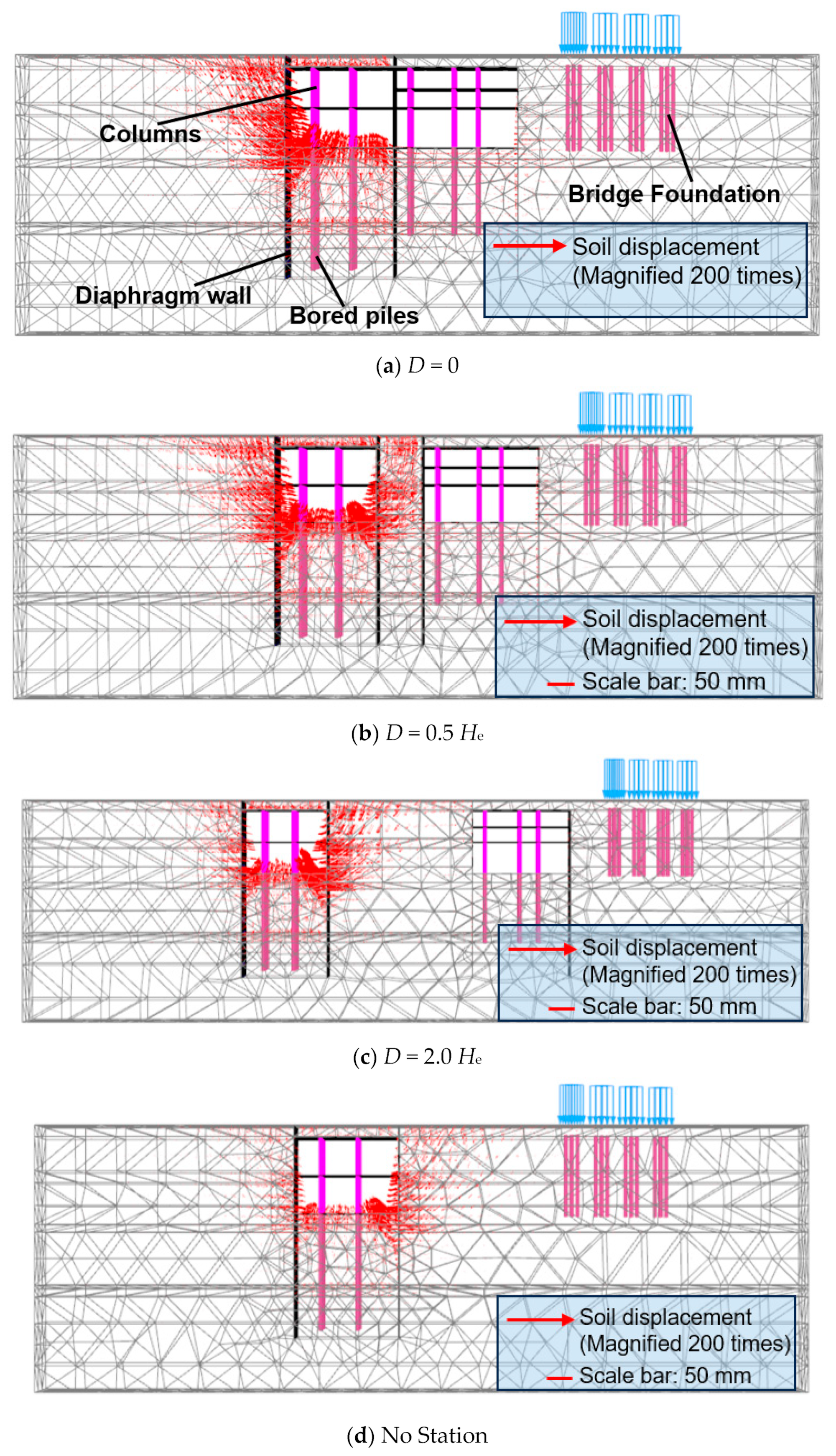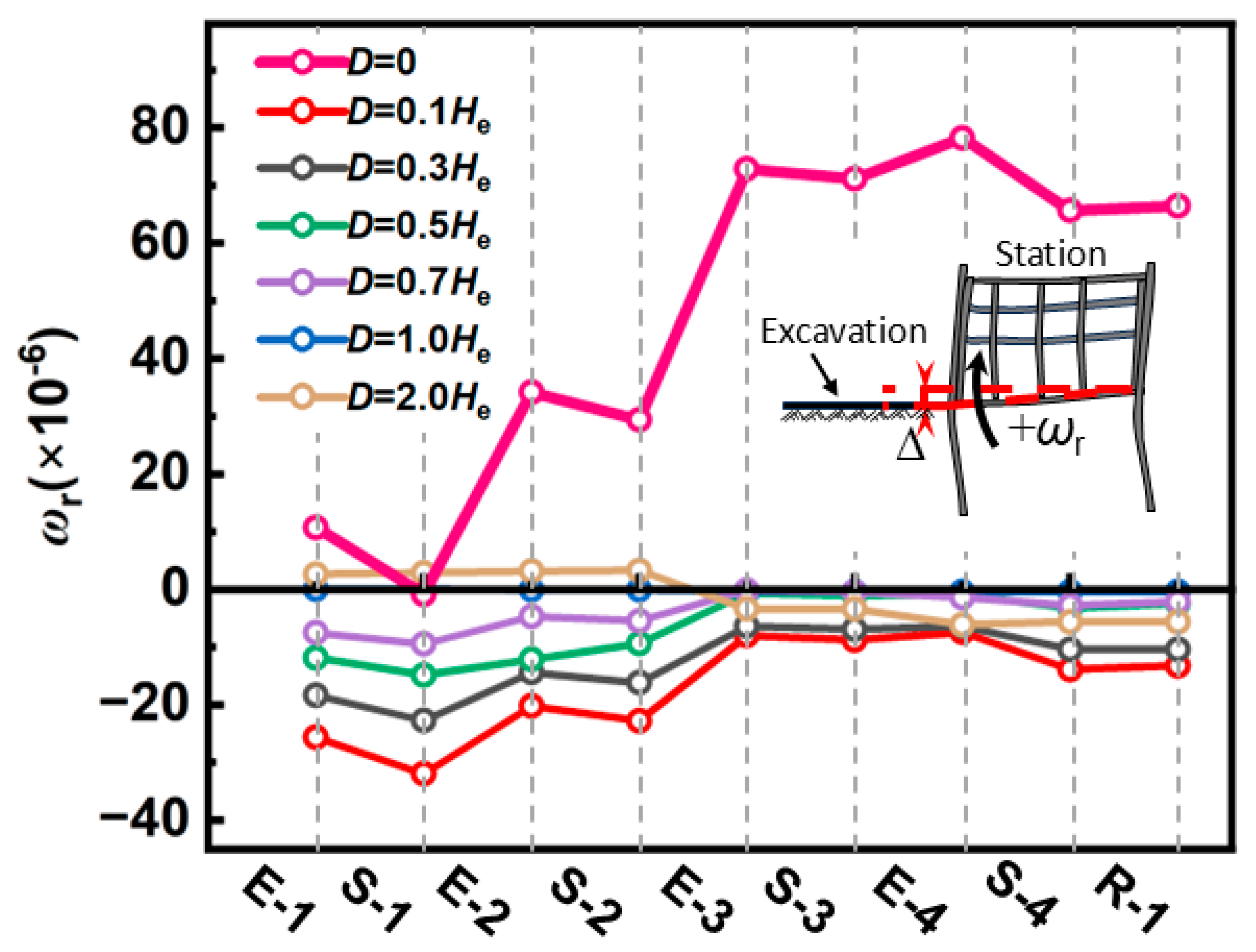 | Distance between the excavation and existing station (D) | 0, 0.1 He, 0.3 He, 0.5 He, 0.7 He, 1.0 He, and 2.0 He |