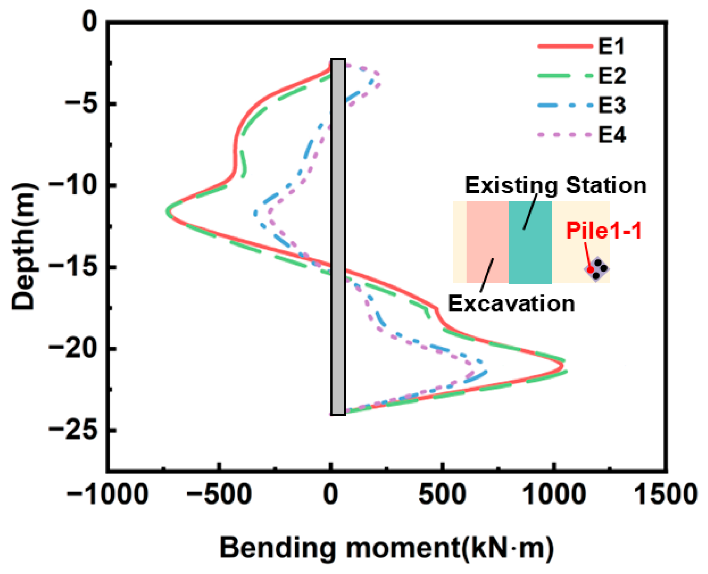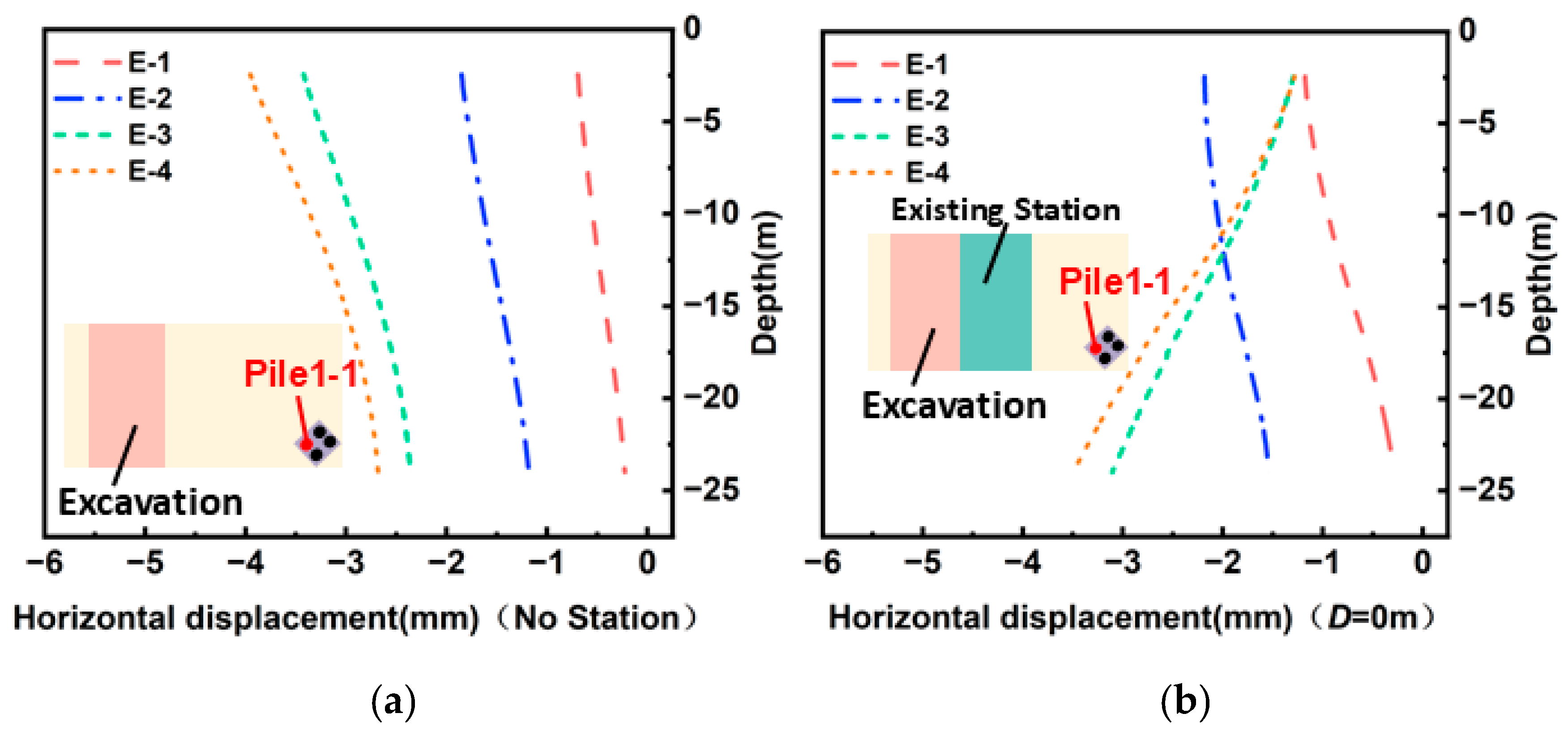 - Shielding effect on piles: The station exerts a significant “shielding effect” on adjacent bridge piles. It restricts shallow soil movement, shifting the pile deformation pattern from a cantilever mode to a deep lateral displacement profile, where the maximum displacement occurs at the pile toe instead of the head.