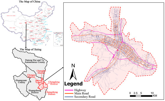 This study selects the central urban area of Xining, Qinghai Province, as the empirical case (Figure 1). Located in the northeastern portion of the Tibetan Plateau, Xining features elevations ranging from 2102 to 2848 m above sea level and serves as a vital demographic and economic hub for the plateau region [35,36]. As a typical representation of the intersection between ecologically fragile plateau zones and rapid urbanization processes, Xining faces unique challenges and an urgent demand for regional sustainable development and low-carbon transition [37]. Therefore, conducting an in-depth study in this area holds significant practical relevance.