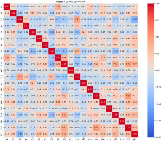 To strictly evaluate the independence and validity of the selected indicators, this study calculated the Pearson correlation coefficients for the 21 explanatory variables. In the visualization, dark colors indicate stronger correlations, while lighter colors denote weak or no correlation (Figure 4). The Pearson correlation coefficient serves as a statistical metric to quantify the degree and direction of linear relationships between variables.