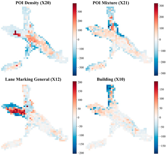 To reveal the local spatial variations in how built environment features influence CEs, we visualized the SHAP values of the top four contributors (Figure 7). In these maps, red indicates a positive SHAP value, blue indicates a negative SHAP value, and the color intensity reflects the magnitude of the impact.