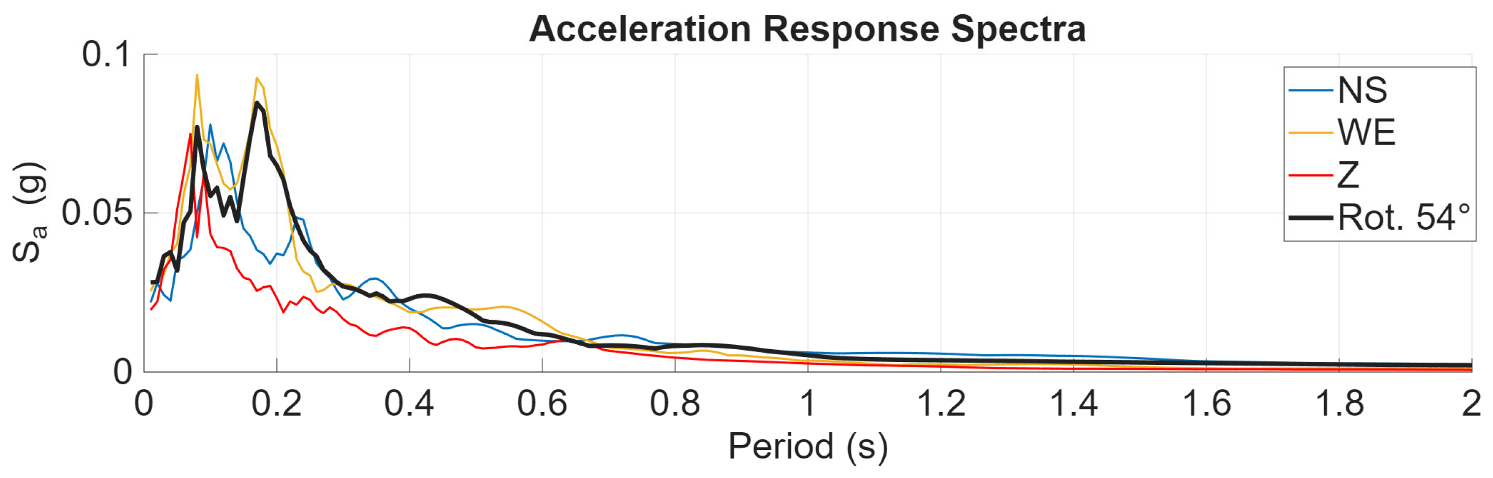 Figure 4), which demonstrate peak spectral ordinates within a narrow range of short vibration periods (approximately 0.1–0.3 s).
