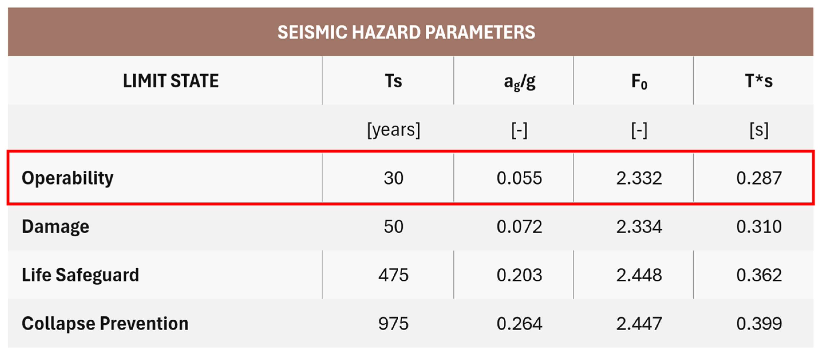 36] for standard buildings (Use Class II, with a nominal life of 50 years) provides a clearer engineering interpretation of the event. In particular, with regard to the operational limit state (SLO),