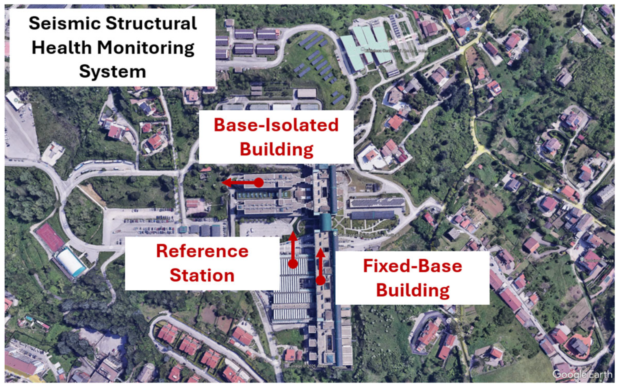 In the preliminary phase of the monitoring campaign, a temporary seismic monitoring network composed of several three-directional force-balance sensors was deployed on selected structures in Potenza. The aim of this deployment was to record the structural response during the aftershock sequence following the 18 March 2025 earthquake. The network was configured with the specific purpose of enabling a direct comparison to be made between different structural typologies that were subjected to an identical seismic input. The temporary monitoring network employed Lunitek TRITON triaxial force-balance accelerometers (FBA) with a full-scale range of ±1 g and 24-bit A/D conversion. The acquisition chain provides a high dynamic range (136 dB at 100 SPS), multi-stage anti-aliasing (fixed 5th-order sinc stage, FIR low-pass with 140 dB attenuation at Nyquist, and analog 2-pole LPF), and GNSS-based timing with sub-microsecond accuracy. The selected processing bandwidth (of the order of 30 Hz) is well within the instrument flat frequency response (from DC to at least 80–100 Hz, depending on configuration), and the observed amplitudes are orders of magnitude below the clipping level, thus excluding any saturation artefact. One triaxial accelerometric station was installed at ground level inside a fixed base structure, providing a reference measurement representative of the input ground motion at the site. A secondary station was installed at the uppermost level of a building, which is characterised by a conventional fixed-base structural system, with the objective of capturing the global response of a non-isolated structure. A third triaxial accelerometric station was installed at the uppermost level of a building equipped with a seismic base-isolation system made by 36 rubber bearings. This enabled the dynamic behaviour of an isolated structure to be directly compared with that of its fixed-base counterpart. In