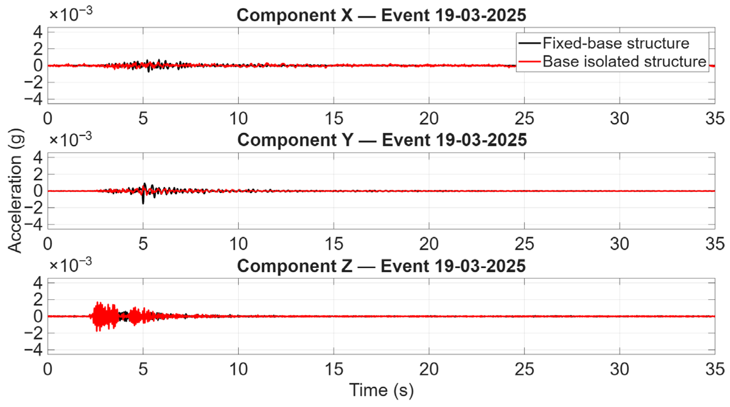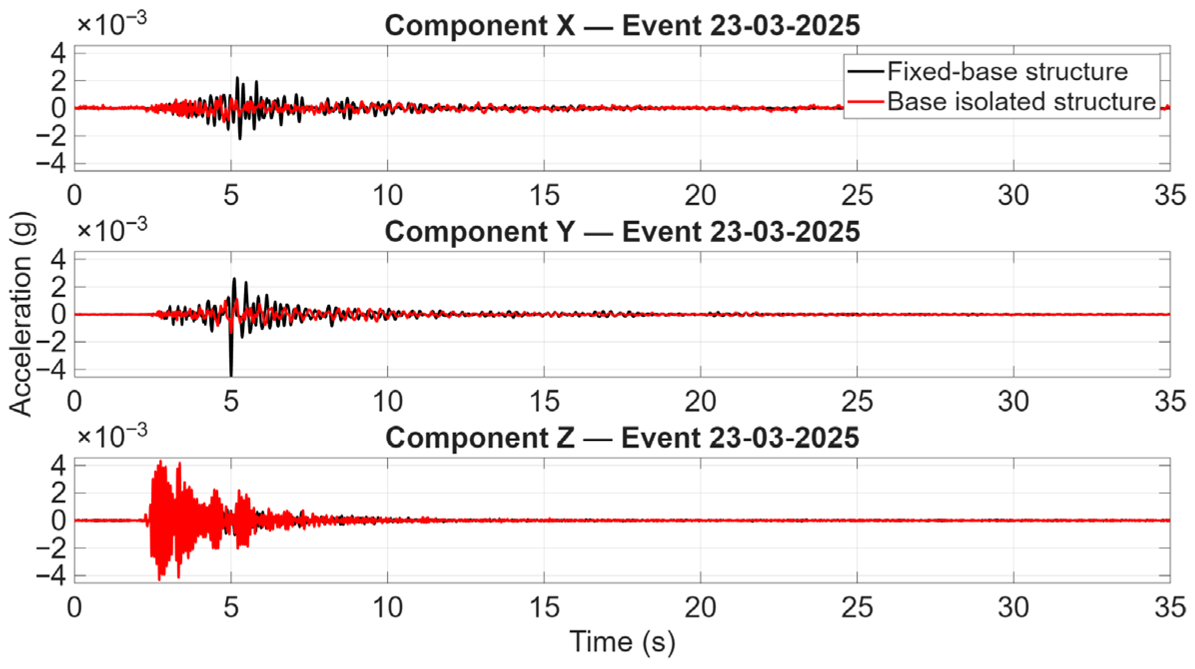 Figure 9 present the three-component acceleration time histories measured at the top level of the fixed-base building and of the base-isolated building, where X, Y, and Z denote the transverse, longitudinal, and vertical components, respectively. Beyond the anticipated similarity in the horizontal response to such low-amplitude input, the engineering-relevant and somewhat unexpected outcome concerns the vertical response: the base-isolated building exhibits a more pronounced amplification of the Z component compared to the fixed-base counterpart. This aspect is of particular significance given that the two structures are essentially twin buildings, located only a few metres apart and therefore subjected to nearly the same input motion, with the main distinguishing feature being the adoption of base isolation in one case and a conventional fixed-base configuration in the other. The observed vertical amplification in the isolated structure, even under very modest PGA levels, suggests that the isolation system and the associated global dynamic characteristics may influence the transmission and/or redistribution of vertical vibration components. It is imperative to consider the potential implications of this phenomenon on serviceability and comfort performance, in addition to the interpretation of operational-level monitoring data.
