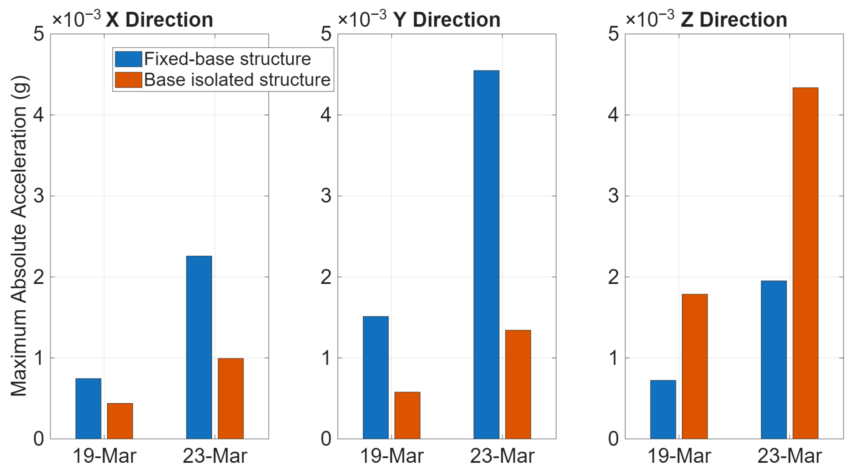 Figure 10, a comprehensive overview of the maximum absolute accelerations recorded at the uppermost level of the two observed twin buildings during the aftershocks that occurred on 19 and 23 March 2025 is provided. This summary is presented separately for the transverse (X), longitudinal (Y), and vertical (Z) components.