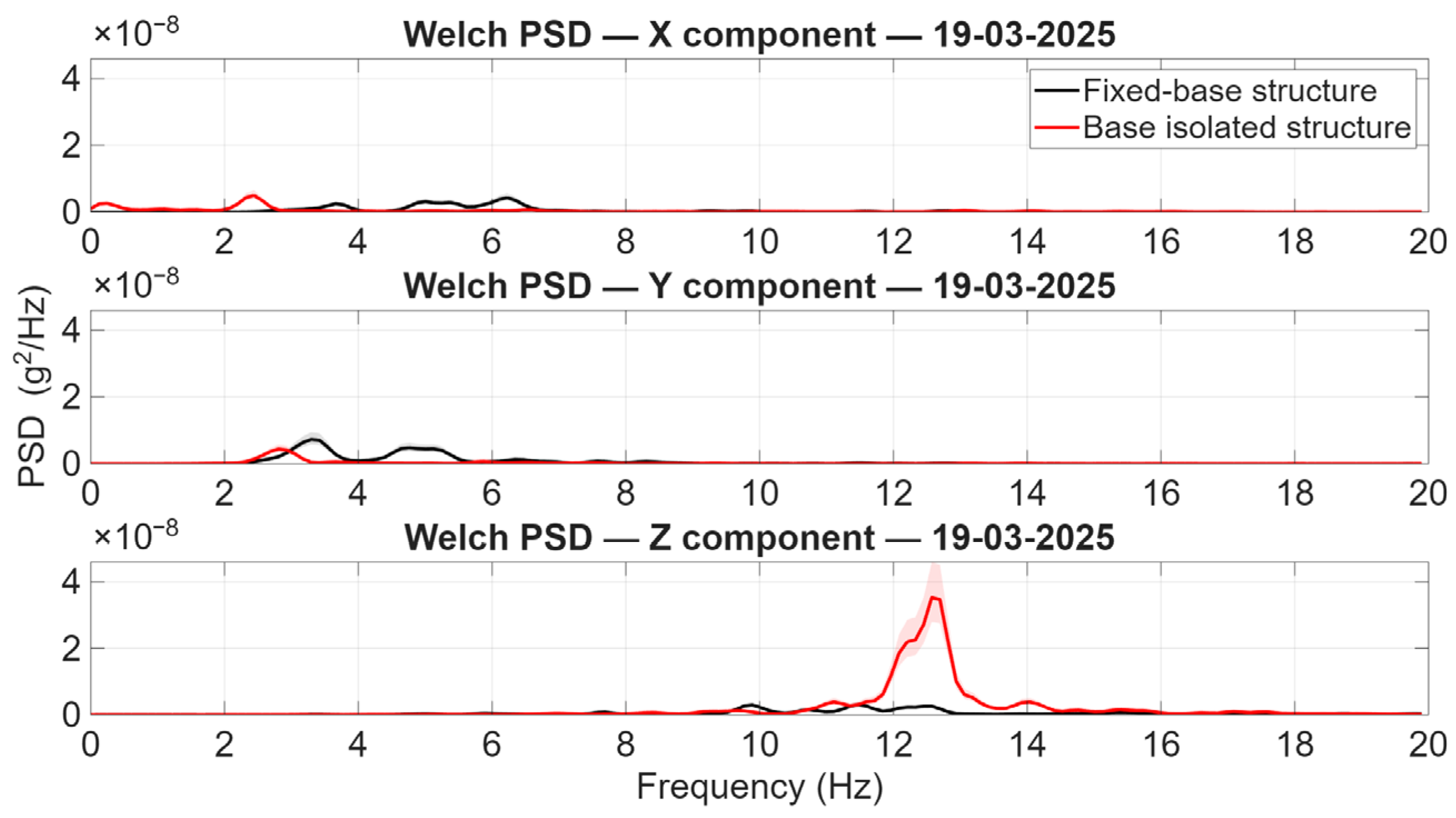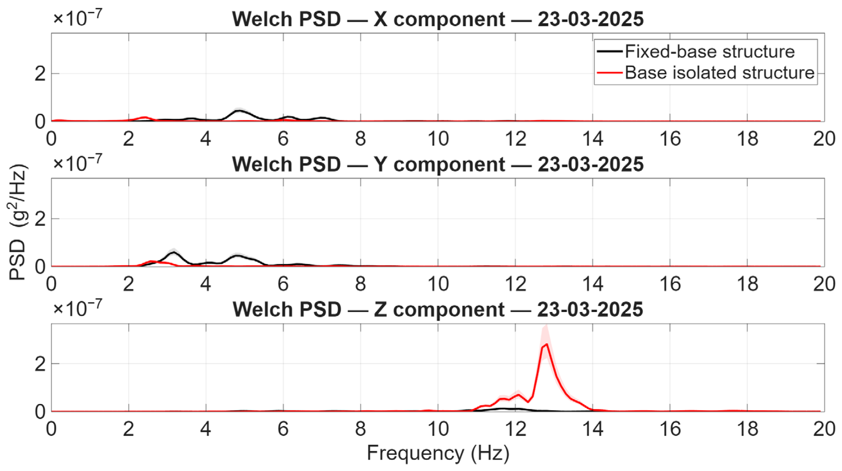 Figure 12 directly. The predominant peaks detected in the horizontal components (X and Y) are in alignment with the fundamental lateral frequencies of the fixed-base structure and, more broadly, with the lateral dynamic characteristics of the superstructure. Conversely, the distinctive peak linked to the horizontal isolation mode is not distinctly apparent in the PSDs. This outcome is technically coherent with the very low input levels of the two aftershocks. It is expected that, under such modest excitation, the isolation system will not enter a significant large-displacement regime. Therefore, the isolation mode is not effectively mobilised in the recorded response. In contrast, the vertical component (Z) displays a clearly identifiable and reproducible spectral peak at approximately 12.6 Hz, which is significantly more pronounced in the base-isolated structure. This peak is attributable to the fundamental vertical vibration frequency of the isolated system, governed primarily by the vertical stiffness of the isolation devices and the mass of the superstructure. In engineering terms, as illustrated in