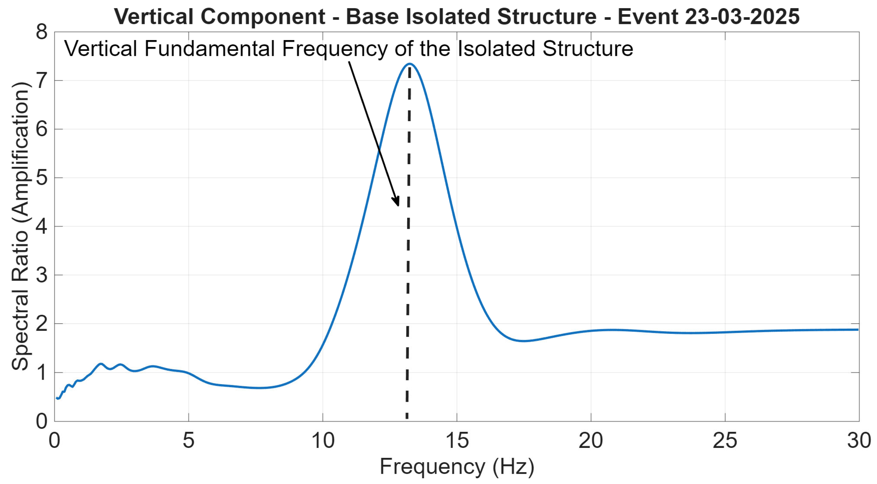 The vertical transfer function was computed to experimentally characterise the superstructure dynamics while minimising the influence of the base input. This was achieved by using the triaxial accelerometric station installed at the top of the base-isolated building superstructure and the reference station. The transfer function was estimated using the same Welch-based spectral estimation settings that were adopted for the power spectral density calculations, ensuring methodological consistency in terms of windowing, overlap, and averaging. The resulting spectral ratio, as illustrated in