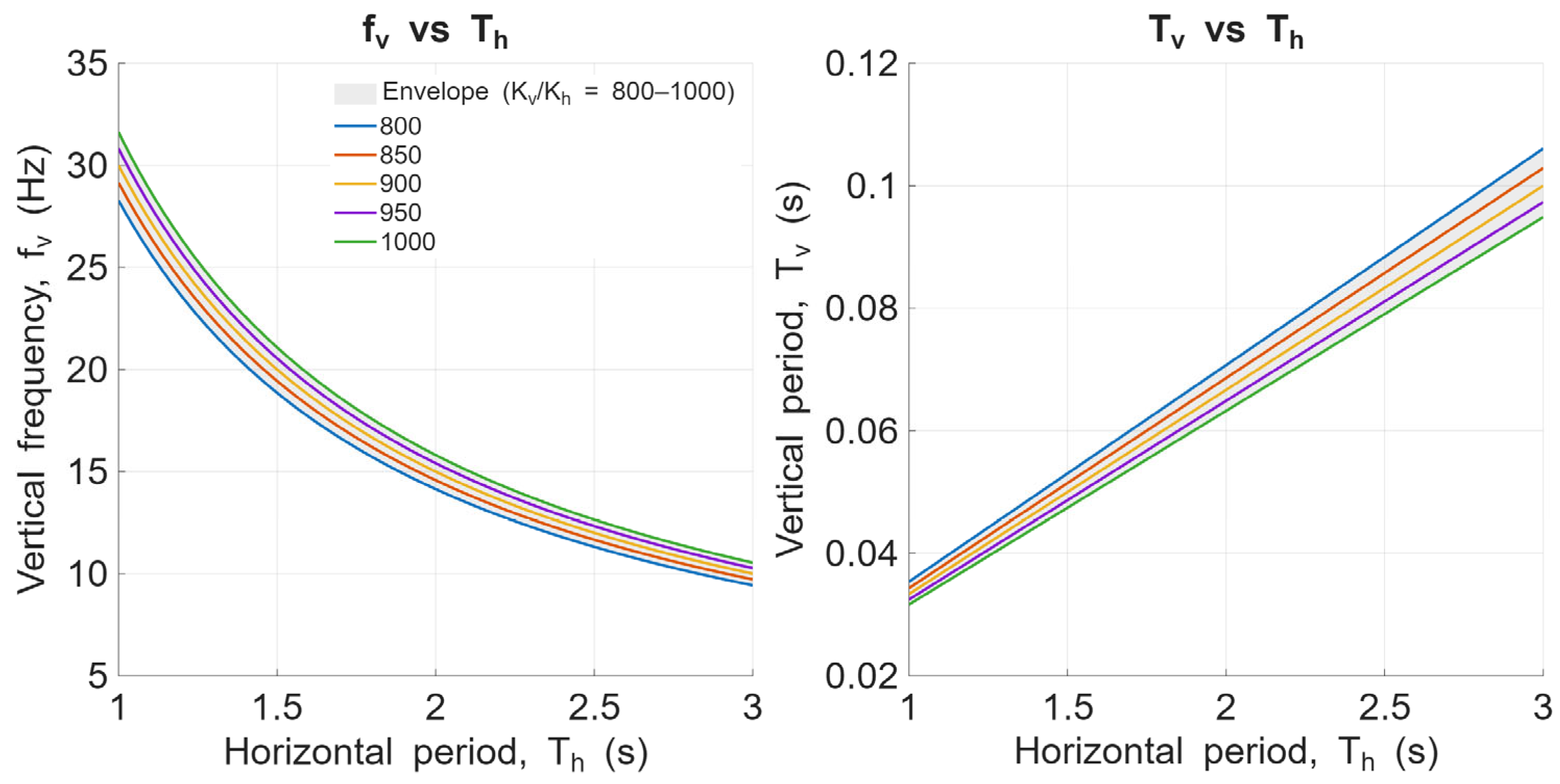 Figure 14, a concise sensitivity-based, back-of-the-envelope consistency check is employed to position the experimentally identified vertical response peak within a physically meaningful range of parameters, as opposed to serving as the principal foundation for frequency identification. Specifically, the figure illustrates how the vertical period and the corresponding vertical frequency vary when the horizontal isolation period is varied between 1 and 3 s and the vertical-to-horizontal stiffness ratio is varied between 800 and 1000. Representative values commonly adopted in practice are shown as curves in the figures, which demonstrate that the resulting vertical characteristic frequency falls in the order of tens of hertz. For instance, for a horizontal period of 2 s and a stiffness ratio of 800, the vertical period is on the order of 0.07 s, corresponding to a vertical frequency of about 14 Hz. This is consistent with the experimentally observed peak identified from the vertical transfer function of the base-isolated building superstructure. This simplified reasoning implicitly relies on the assumption that the effective participating mass associated with the isolation-dominated horizontal response is comparable, in order of magnitude, to that governing the vertical response of the isolated configuration. Such an assumption is plausible in the context of seismic base isolation because the isolation strategy is intended to produce a dynamically distinct response of the isolated system with respect to the corresponding fixed-base configuration.
