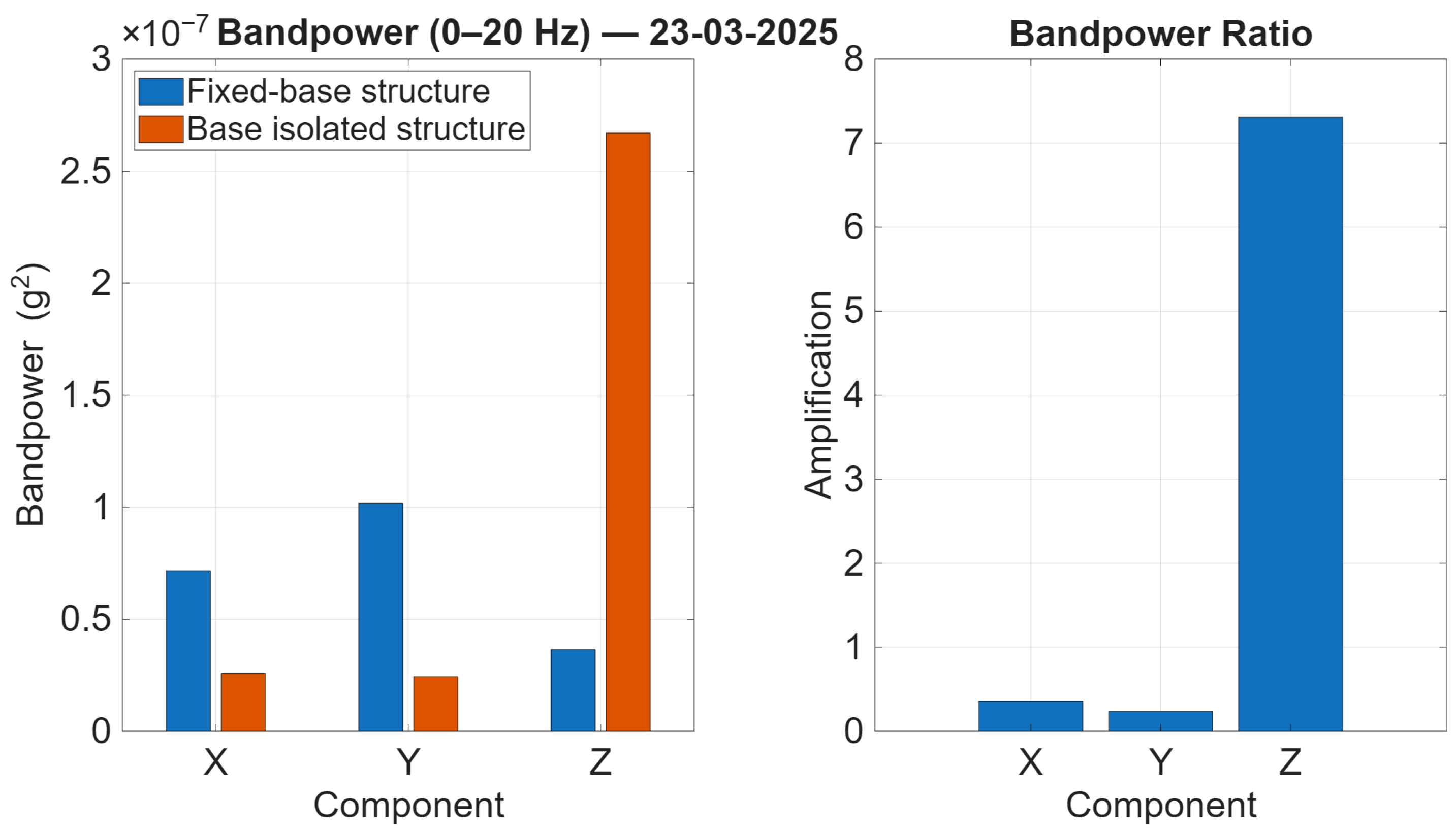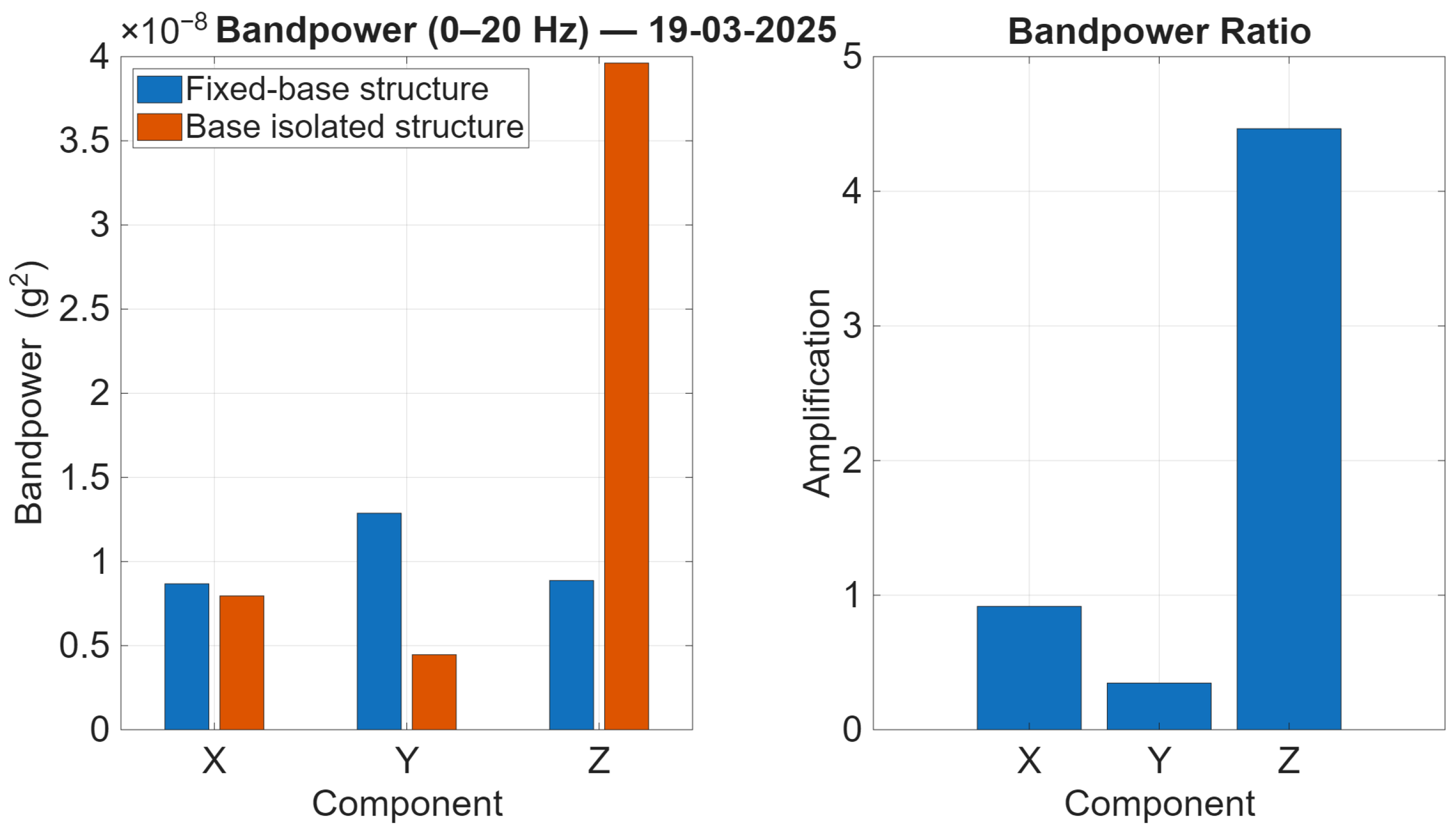 Figure 15, the bandpower levels indicate that the base-isolated structure demonstrates comparable or reduced energy in the horizontal components. In contrast, the vertical component exhibits a significant increase in comparison with the fixed-base building. As demonstrated in the ratio plot, this component-dependent behaviour is accentuated by the fact that the horizontal ratios remain below unity, while the vertical ratio is significantly greater than one. This is coherent with the pronounced vertical spectral peak that was observed in the PSDs.