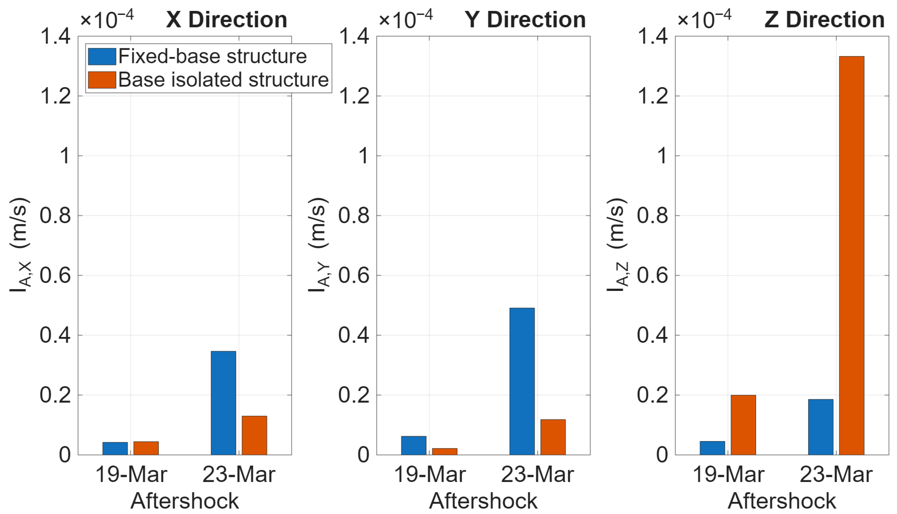 This has been achieved through separate analysis of the transverse (X), longitudinal (Y), and vertical (Z) components, as well as the aftershocks that occurred on both 19 March and 23 March. The results provide an energy-based confirmation of the trends previously observed in the time and frequency domains. In the horizontal directions (X and Y), the base-isolated structure generally exhibits a lower Arias intensity than the fixed-base structure, indicating a reduced accumulation of vibration energy in the superstructure. This approach aligns with the prescribed horizontal mitigation strategy. In contrast, the vertical component shows a distinct behavior that plays a pivotal role. The base-isolated edifice evinces considerably elevated air intensity in Z, with the discrepancy becoming distinctly more pronounced for the 23 March occurrence.