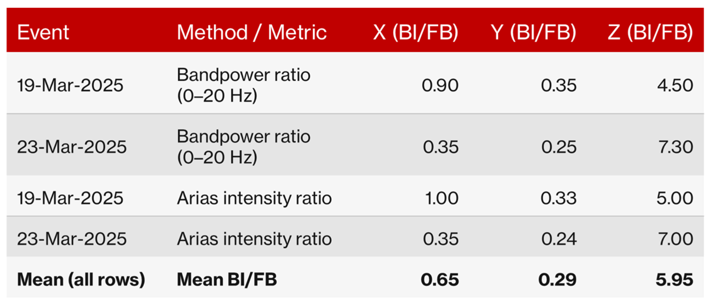 Figure 18 provides an engineering-meaningful synthesis of the observed amplification trends by reporting Base-Isolated to Fixed-Base (BI/FB) ratios obtained from both bandpower (0–20 Hz) and Arias intensity.