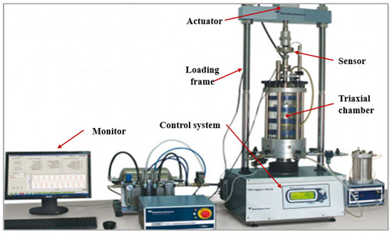 The cyclic triaxial tests followed the loading sequence recommended by AASHTO T307-99 for subgrade soil, as detailed in Table 3 [22]. A half-sine waveform was employed for loading, with a 0.2 s load duration and a 0.8 s rest period. Three parallel specimens were tested under each test condition, and the average resilient modulus of the three specimens was calculated for analysis. The Cyclic Triaxial System (CTX) was used to conduct the test, as shown in Figure 1. The resilient modulus test comprises preloading and testing phases. Initially, a cyclic half-sine pulse load with an axial stress of 27.6 kPa and confining pressure of 41.4 kPa is applied to the specimen for 1000 cycles. Subsequently, a similar half-pulse load approximating the target axial stress is applied 100 times, with a frequency of 1 Hz.