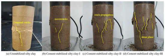 After reaching their peak values, the UCSs of both cement-stabilized soil and original soil decline rapidly, exhibiting brittle failure characteristics with distinct shear failure planes. The failure process of cement-stabilized soil specimens can be divided into three stages, as illustrated in Figure 2. The first stage corresponds to the emergence of microcracks, shown in Figure 2a,b. Figure 2c captures the second stage, where these cracks propagate further in parallel or slightly inclined directions without forming an obvious shear plane. The third stage illustrated in Figure 2d occurs under critical stress, where microcracks interconnect to form large cracks, leading to the development of a shear slip plane and complete failure of the specimen. This phenomenon arises because the addition of cement to silty clay initiates a series of physicochemical reactions between the cement and soil, creating a spatial structure within the soil mass that enhances the strength of the cement-stabilized soil [23,24]. Once this structure is disrupted by external loads, the strength of the cement-stabilized soil decreases rapidly. Furthermore, a crucial distinction from original soil lies in the fact that once the internal structure of cement-stabilized soil is compromised, its strength becomes notably difficult to regain. This highlights the irreversible nature of the structural integrity and strength enhancement conferred by the cement stabilization process [25].