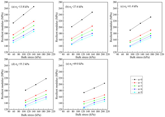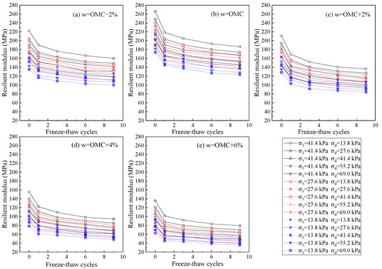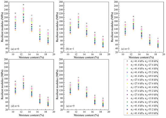 As shown in Figure 3, the symbols σ3, σd, and n denote the confining pressure, deviator stress, and freeze–thaw cycles, respectively. Under identical stress conditions and F–T cycles, the resilient modulus attains its optimal value at OMC. Furthermore, significant variations are observed in the resilient modulus at moisture contents above and below the OMC. When the moisture content is below OMC, the resilient modulus changes relatively gradually, whereas a more rapid variation is observed when the moisture content exceeds OMC.