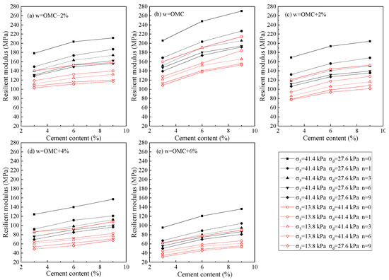 When investigating the influence of varying cement contents on the resilient modulus of cement-stabilized silty clay, due to the numerous loading sequences, two representative loading sequences were selected for analysis to assess the effect of cement content on the resilient modulus. These sequences are referenced from the Strategic Highway Research Program (SHRP) P-46 study [26], which proposed a 154.6 kPa volumetric stress and 13.0 kPa octahedral shear stress, and the National Cooperative Highway Research Program (NCHRP) 1-28A study [27], which specified an 83.0 kPa volumetric stress and 19.3 kPa octahedral shear stress. These correspond to loading sequences 2 and 13, respectively, in T307-99. The compaction degree was set at 95%, and the corresponding changes in the resilient modulus of cement-stabilized soil with varying cement contents, considering different initial moisture contents and F–T cycles, are illustrated in Figure 4.