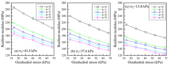 Figure 6 and Figure 7 show the variations in the resilient modulus when the cement content was 6%, the degree of compaction was 95%, and the OMC was maintained. When the confining pressure is constant, the dynamic resilient modulus of cement-stabilized silty clay generally decreases gradually with the increase of octahedral stress, aligning with the same variation pattern observed in subgrade soil. Under the same deviatoric stress state, the resilient modulus of cement-stabilized silty clay linearly increases with an increase in volumetric stress, maintaining a proportional relationship that is in line with the observations reported by Muir Wood and Ng [30,31].