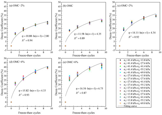 Assuming a 6% cement content and under the same stress state and initial moisture content, the decay coefficient of the resilient modulus is solely dependent on the moisture content. Based on this premise, the correlation between the number of F–T cycles and the decay coefficient of the resilient modulus was analyzed. As evident from the experimental results and fitted outcomes presented in Figure 9, the decay coefficient of the resilient modulus approximately follows a logarithmic function trend. A relationship between the decay coefficient of the resilient modulus, the number of F–T cycles, and the moisture content were established, as expressed in Equation (2). It can be observed that the logarithmic function equation provides a good fit for the relationship between the number of F–T cycles and the decay coefficient of the resilient modulus, with R2 values ranging from 0.87 to 0.94.
