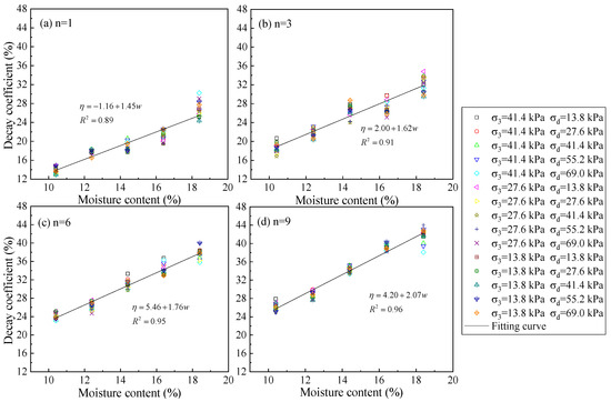 The fitting results of the attenuation coefficient and initial moisture content under different F–T cycles are summarized in Table 4.