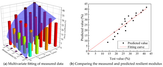 Using Equation (4) for analysis and fitting, all regression coefficients and correlation coefficients of the empirical model were obtained, as shown in Table 5. Figure 11 presents a comparison of the predicted and measured resilience modulus degradation coefficients. As illustrated in Figure 11, all experimental results are represented as bar charts, while the predicted resilience modulus degradation coefficients using Equation (4) are depicted as surface meshes. Figure 11 specifically contrasts the predicted results with the test outcomes. The comparative analysis between the experimental and predicted results demonstrates that the model’s predictions of resilience modulus degradation coefficients exhibit good agreement with the experimental data.