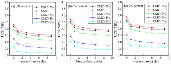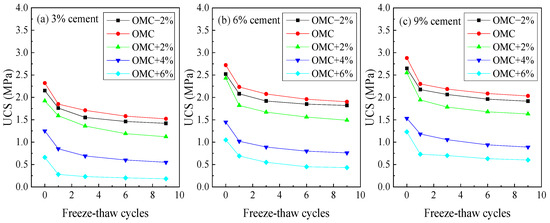 By selecting the OMC and OMC + 6% as the initial moisture conditions, the relationship between the UCS of cement-stabilized silty clay after F–T cycles and the cement content was analyzed, as illustrated in Figure 13. The impact of cement content on the UCS of cement-stabilized silty clay under freeze–thaw conditions was pronounced. Under the same number of F–T cycles, the UCS degradation rate of cement-stabilized soil with a 9% cement content is consistently lower than that with a 3% cement content, indicating that an increase in cement content enhances the frost resistance of the soil. Specifically, after nine F–T cycles, the UCS of cement-stabilized silty clay with a 3% cement content declines from 2.32 MPa and 0.66 MPa to 1.52 MPa and 0.18 MPa, respectively, with strength loss rates of 34.48% and 72.73%, respectively, marking a significant reduction. For a 6% cement content, the UCS loss rates after nine cycles are 30.11% and 59.05%, respectively. Furthermore, at a 9% cement content, the UCS loss rates decrease to 29.41% and 51.22%, respectively. As the cement content increases, the UCS loss rate gradually decreases, albeit at a slower pace, aligning with a logarithmic growth trend. Balancing material performance and economic considerations, the optimal cement content should be controlled within 6%.