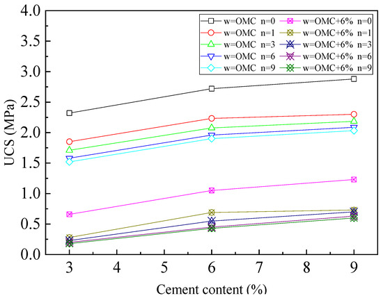 The UCS of both the cement-stabilized soil and original soil gradually decreases as the number of F–T cycles increases. Under the same initial conditions, the UCS of cement-stabilized soil is significantly higher than that of original soil; after nine F–T cycles, at OMC and OMC + 6%, the UCS of cement-stabilized soil is 3.11 times and 1.95 times that of original soil, respectively.