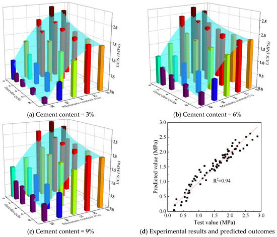 where UCS represents the unconfined compressive strength of cement-stabilized soil and w and n denote the initial moisture content and the number of F–T cycles, respectively. The coefficients a and b are regression coefficients related to the impact of initial moisture content, c represents the regression coefficient associated with the effect of F–T cycles, and d serves as a comprehensive regression coefficient.