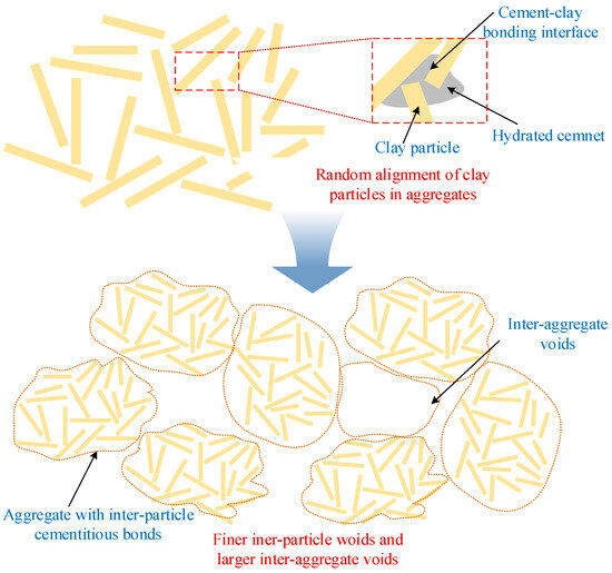 After cation exchange, the inter-particle distance decreases. The cation exchange leads to flocculation of clay particles, causing regularly oriented particles to become randomly oriented and form aggregates, as shown in Figure 18. Within these aggregates, the primary bonding is provided by the precipitation and intergrowth of nanoscale calcium silicate hydrate (C–S–H) gel from cement hydration. This cementitious matrix physically encapsulates and chemically bonds the soil particles, filling the pores within the flocculated structure. Compared to the original dispersed fabric of the untreated soil, this process (cation exchange and flocculation) transforms the microstructure into a more aggregated, open fabric, which is subsequently cemented by hydration products [35].