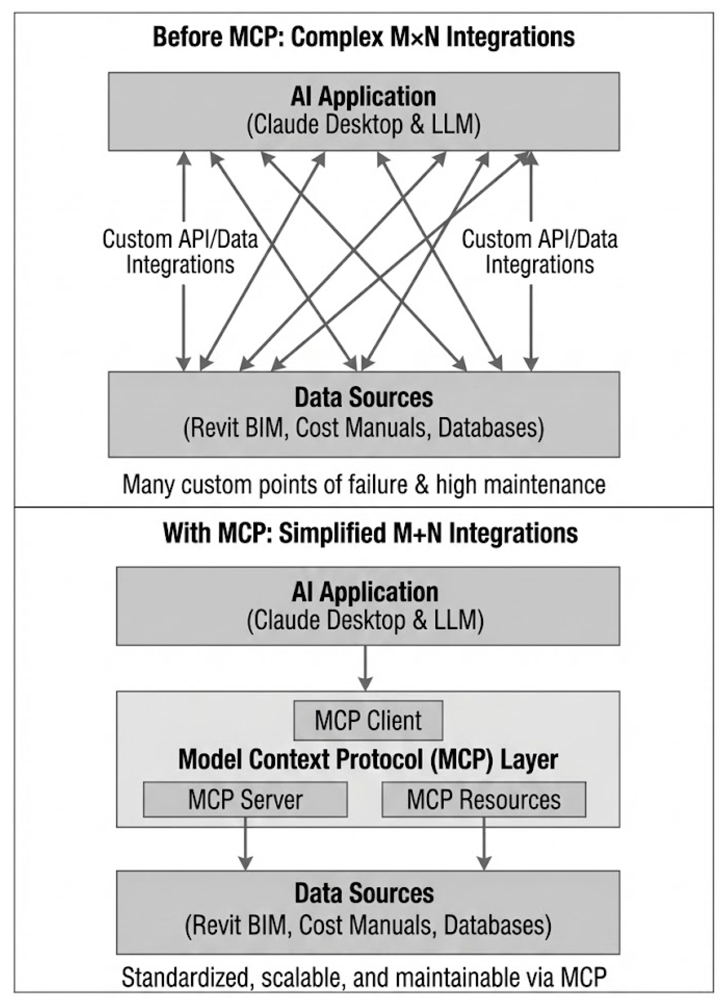 | Integration Method | Relies on custom, one-off solutions (APIs, plugins) that are hard to scale. | Introduces standardized protocol MCP as a universal adapter, solving the “M × N” integration problem. |