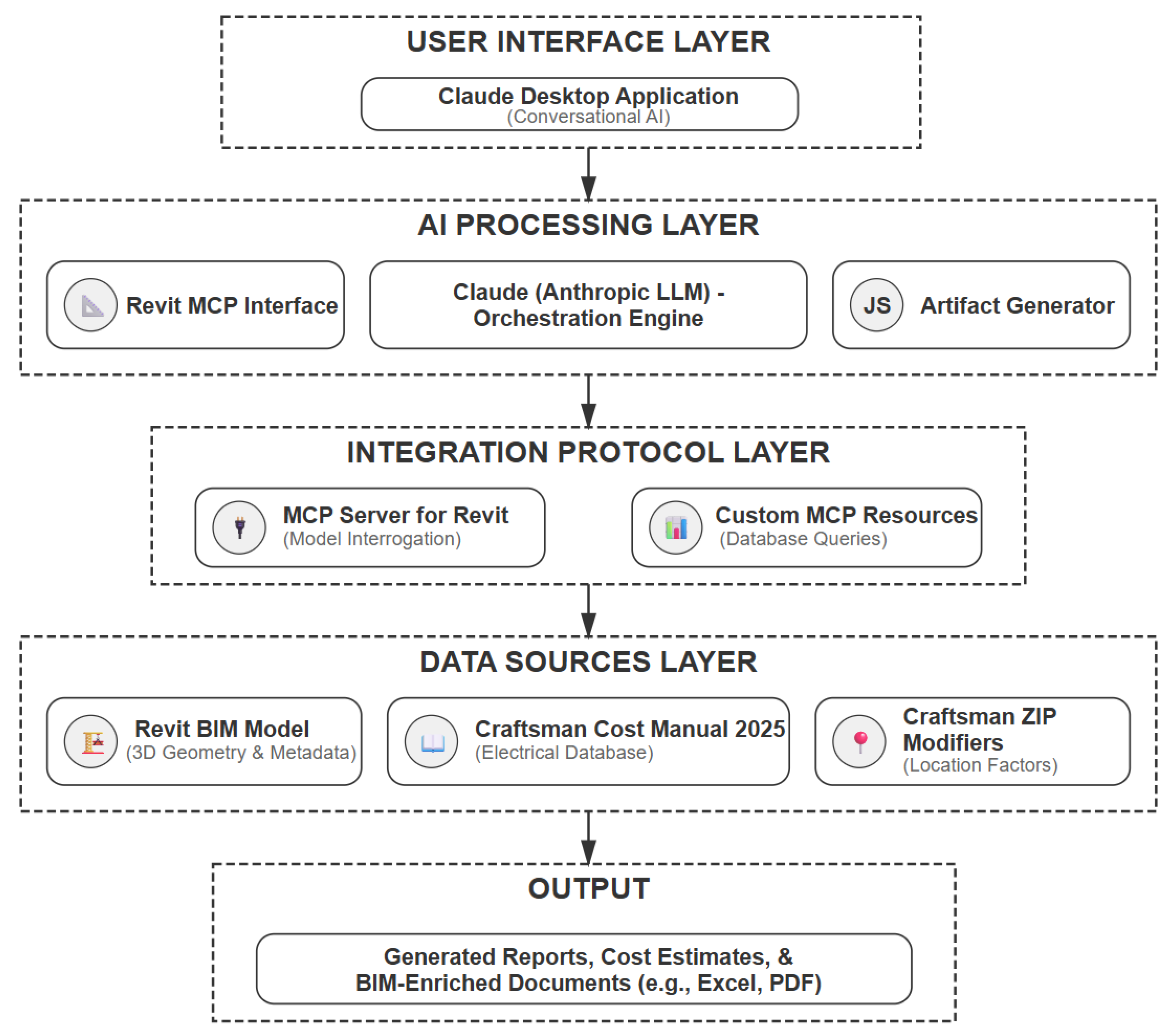 - Framework Development: Design a scalable four-layer architecture using the MCP to enable LLMs to communicate directly with BIM platforms such as Autodesk Revit and industry cost databases.
